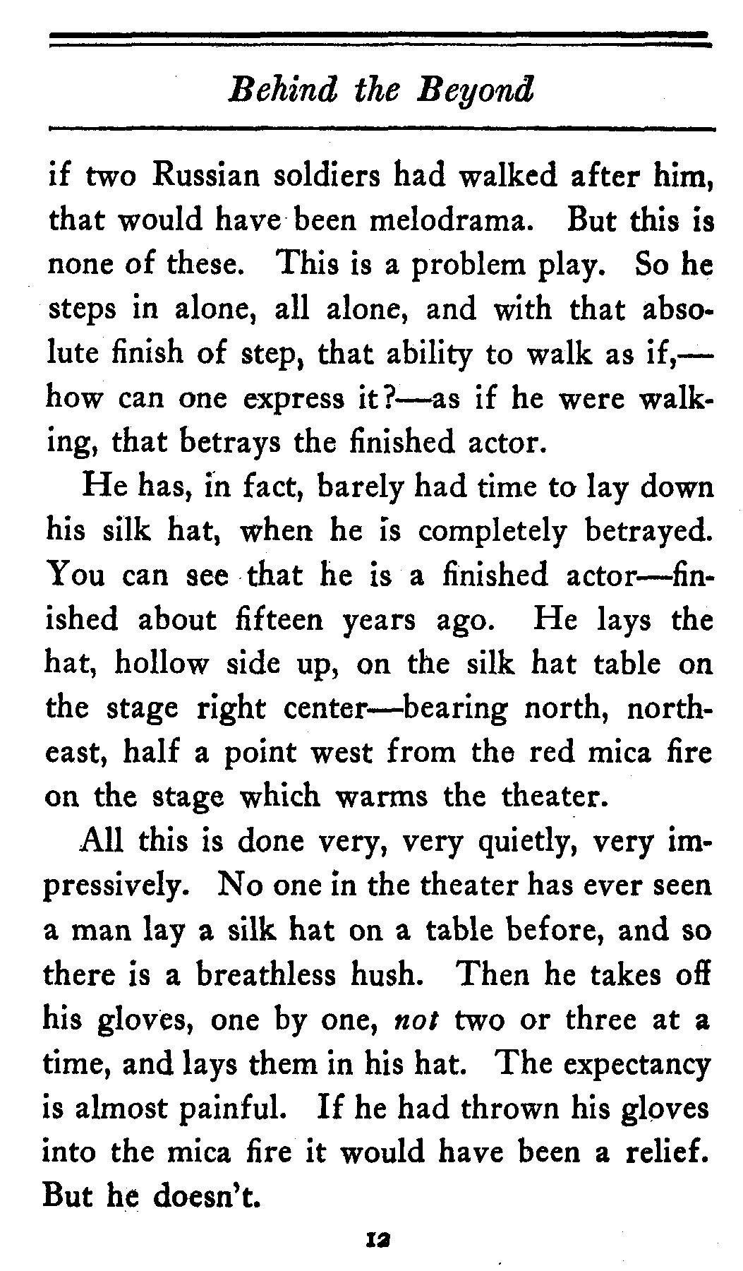 All this is done very, very quietly, very impressively. No one in the theater has ever seen a man lay a silk hat on a table before, and so there is a breathless hush. Then he takes off his gloves, one by one, not two or three at a time, and lays them in his hat. The expectancy is almost painful. If he had thrown his gloves into the mica fire it would have been a relief. But he doesn't.