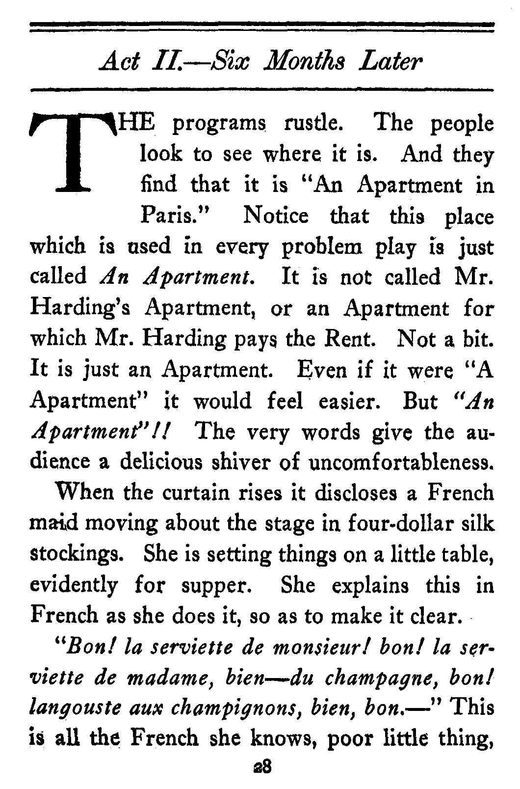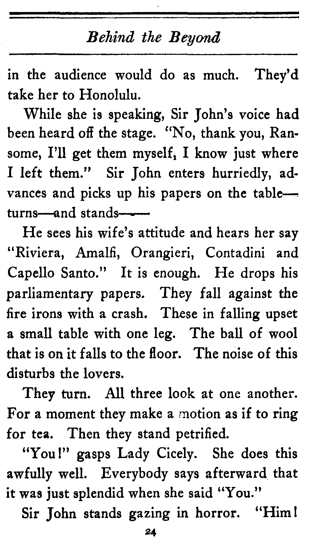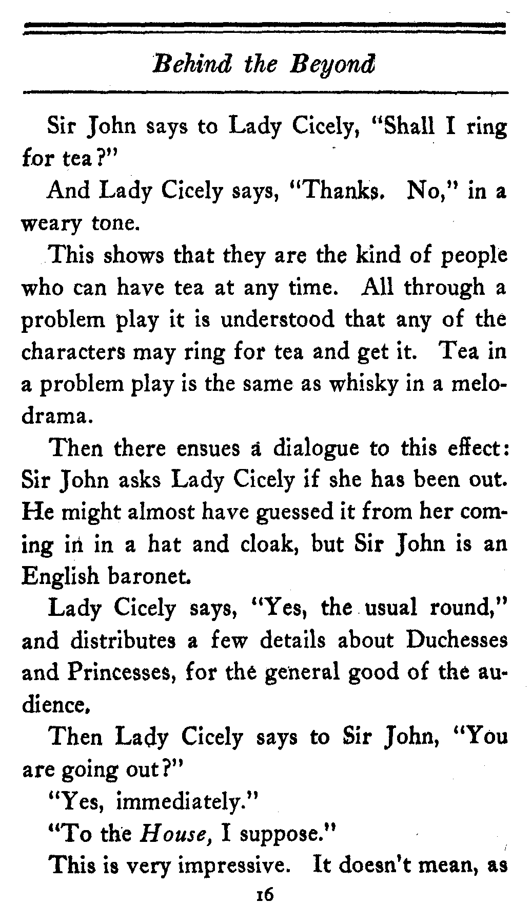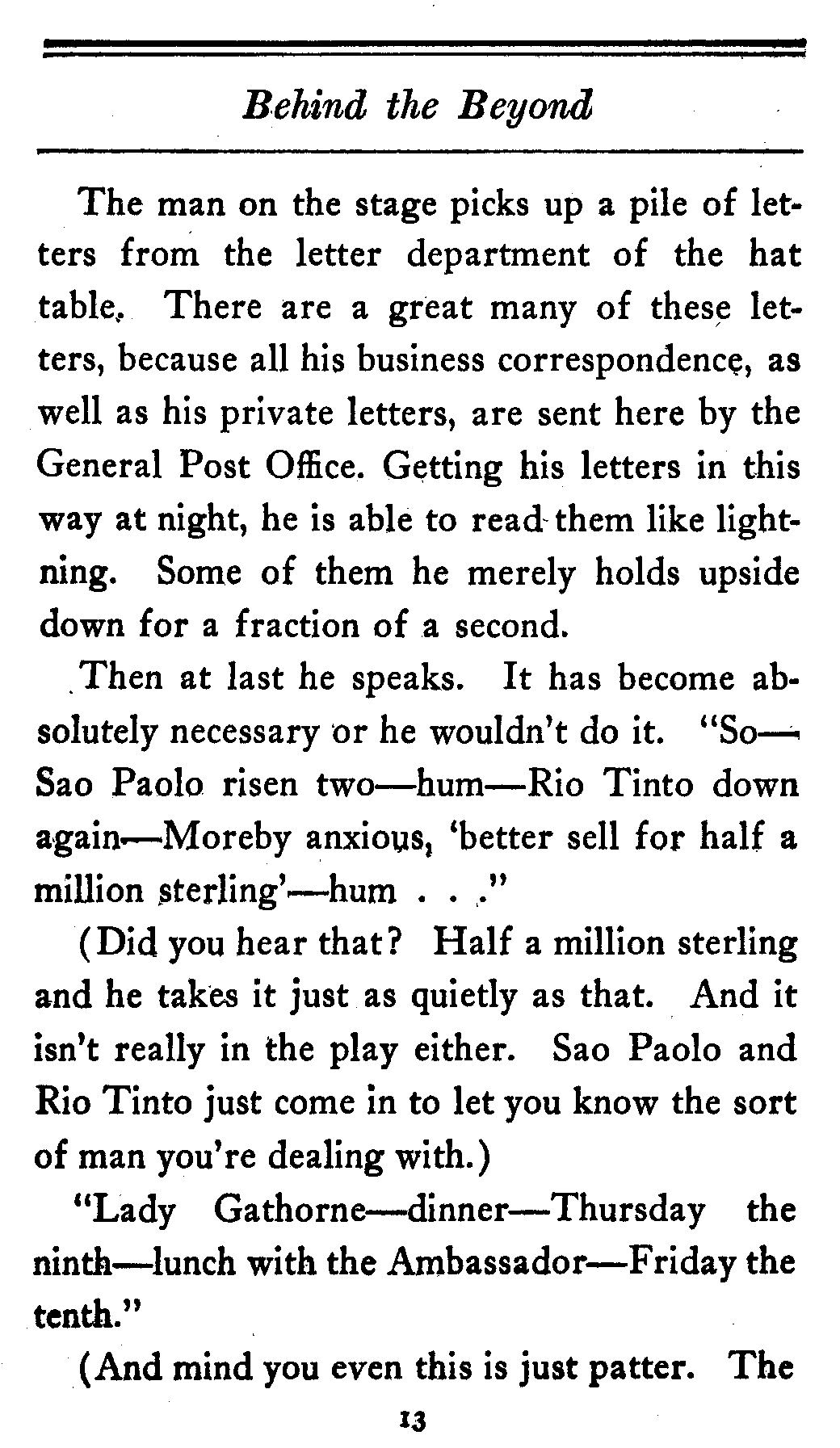 (And mind you even this is just patter. The[14] Ambassador doesn't come into the play either. He and Lady Gathorne are just put in to let the people in the cheaper seats know the kind of thing they're up against.)