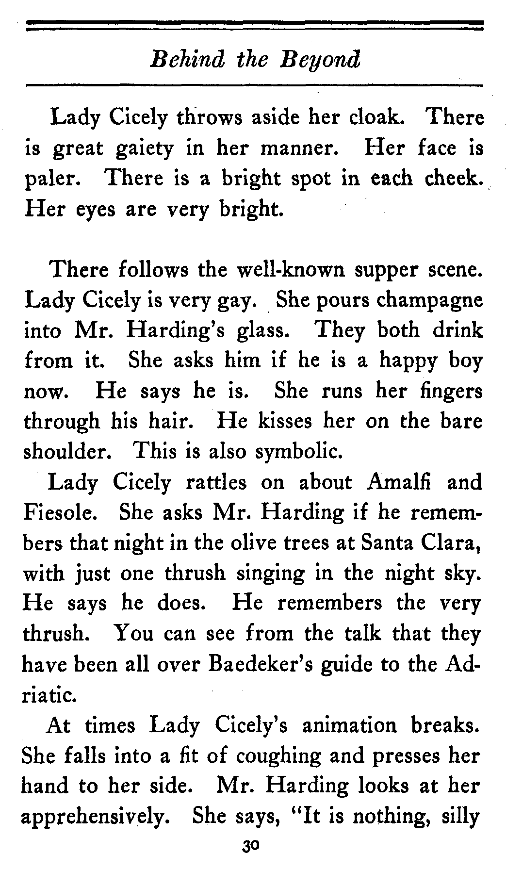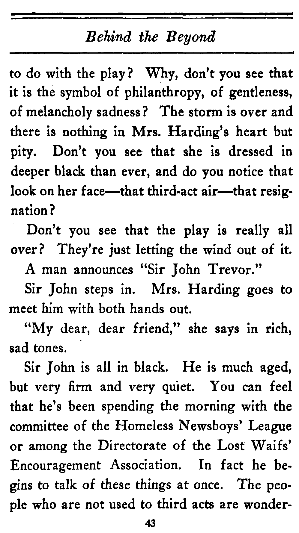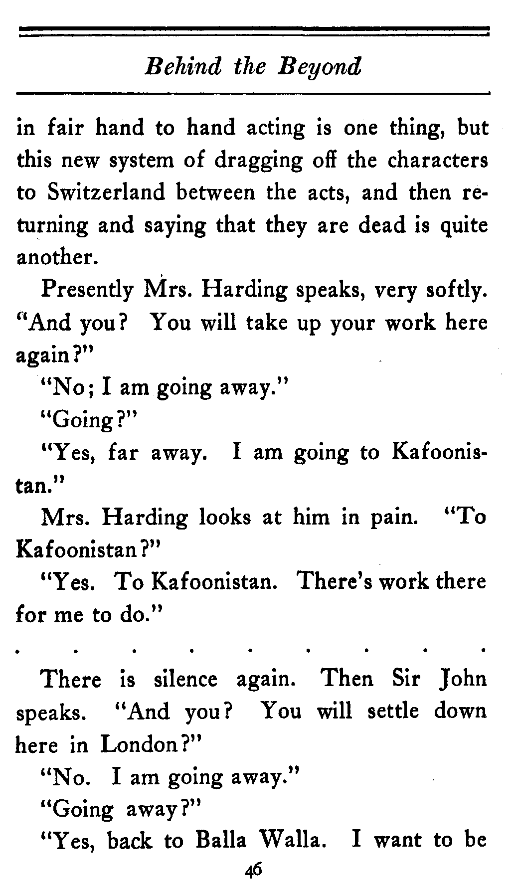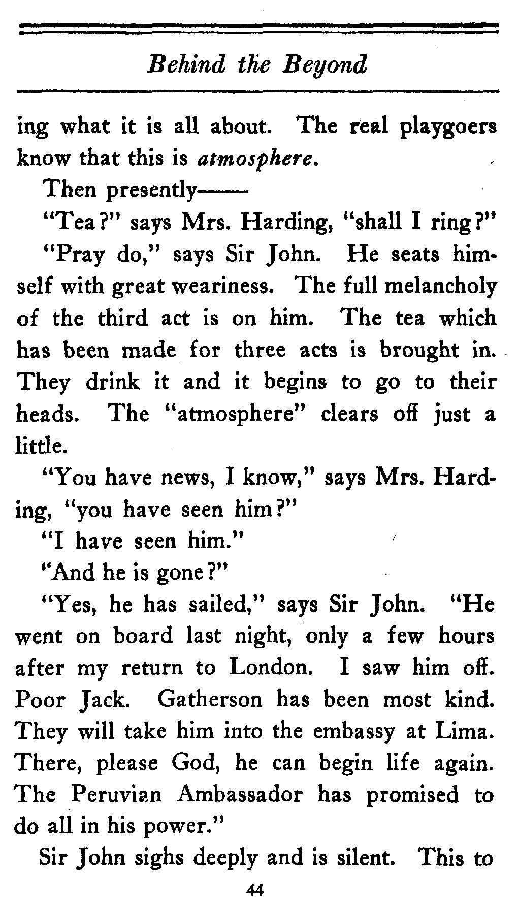 (And mind you even this is just patter. The[14] Ambassador doesn't come into the play either. He and Lady Gathorne are just put in to let the people in the cheaper seats know the kind of thing they're up against.)