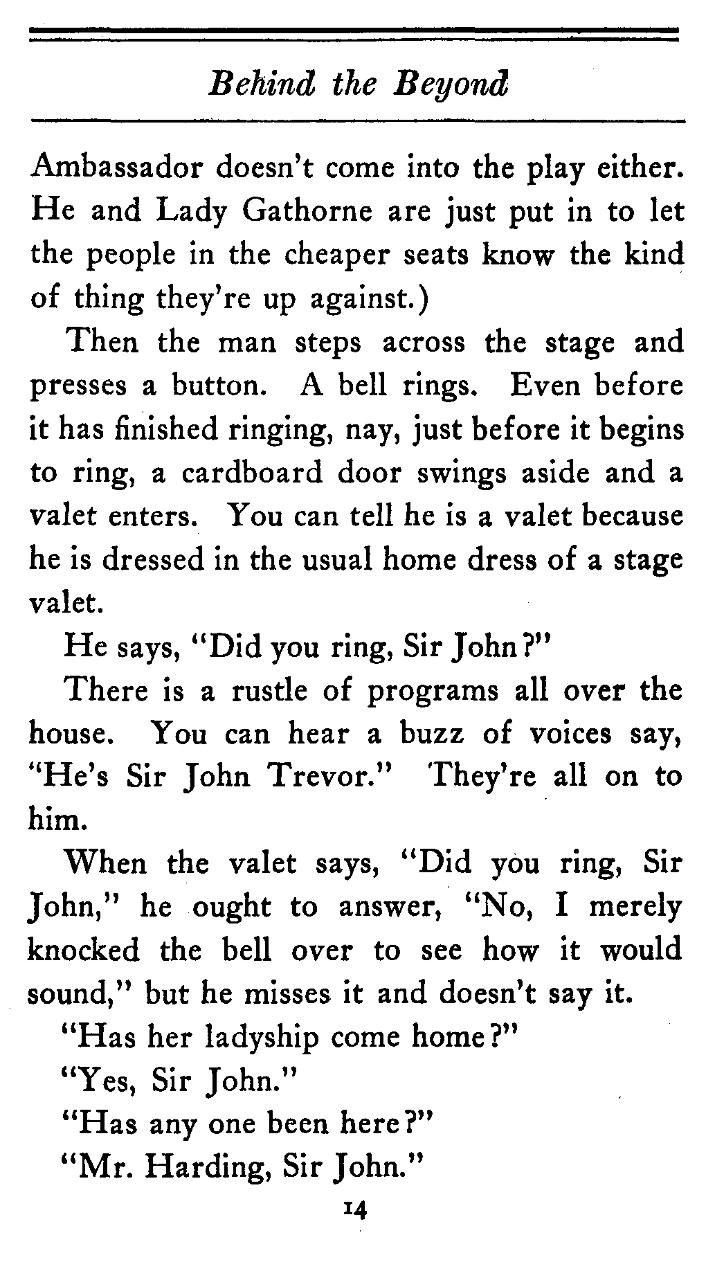 When the valet says, "Did you ring, Sir John," he ought to answer, "No, I merely knocked the bell over to see how it would sound," but he misses it and doesn't say it.