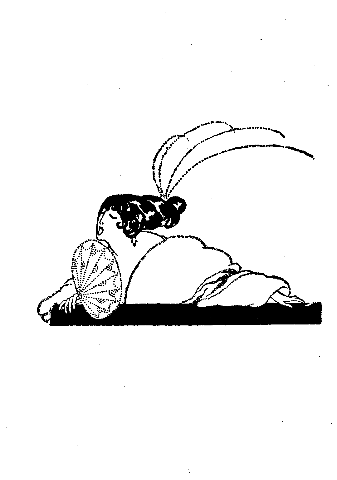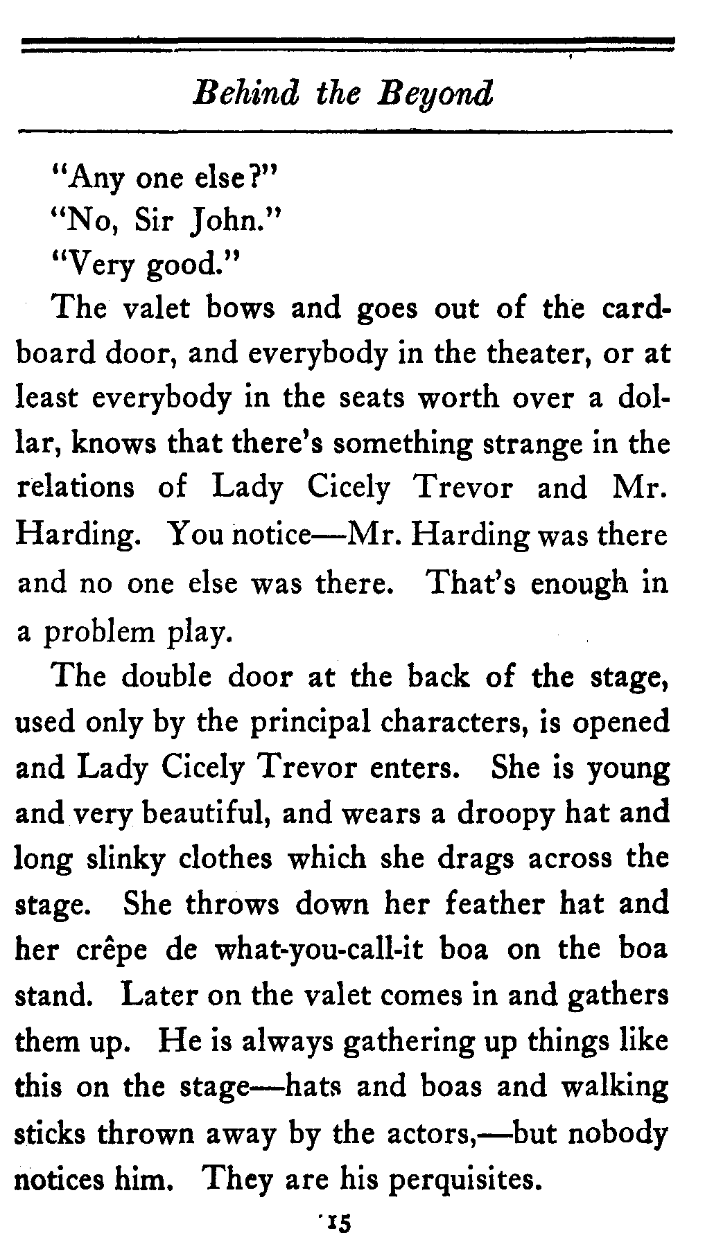 The double door at the back of the stage, used only by the principal characters, is opened and Lady Cicely Trevor enters. She is young and very beautiful, and wears a droopy hat and long slinky clothes which she drags across the stage. She throws down her feather hat and her crêpe de what-you-call-it boa on the boa stand. Later on the valet comes in and gathers them up. He is always gathering up things like this on the stage—hats and boas and walking sticks thrown away by the actors,—but nobody notices him. They are his perquisites.[16]