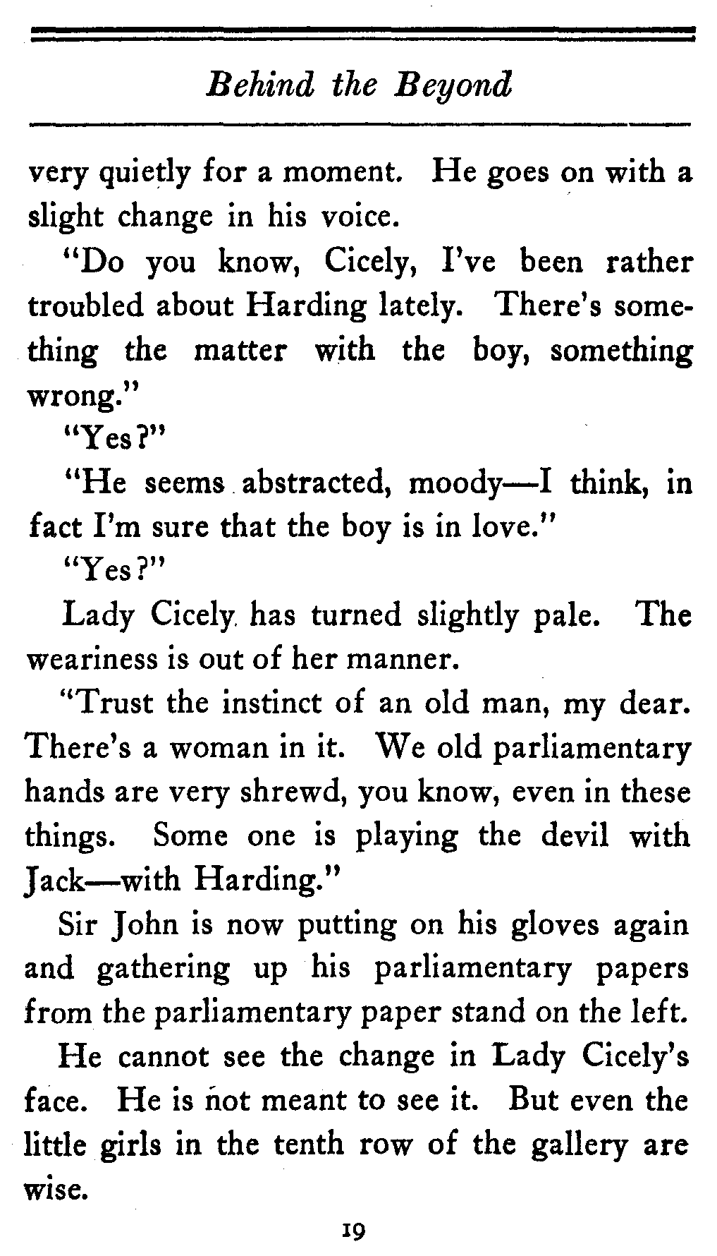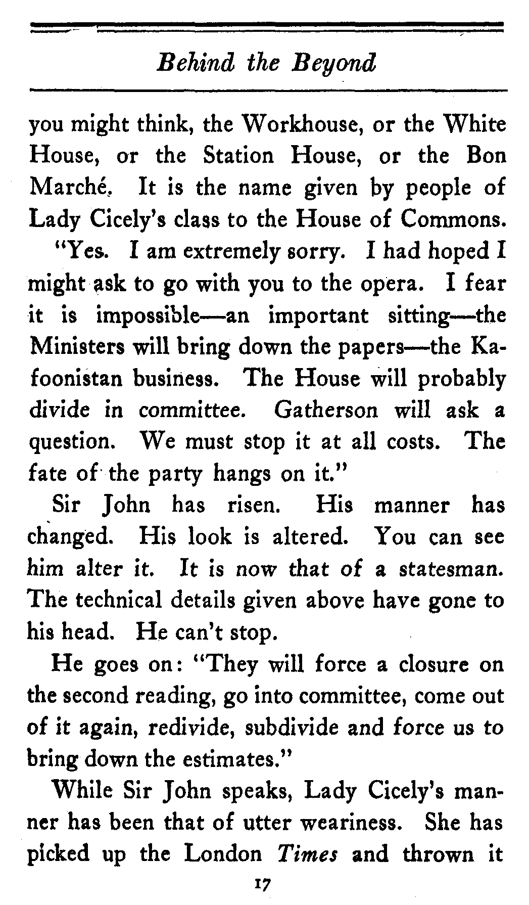 This is very impressive. It doesn't mean, as[17] you might think, the Workhouse, or the White House, or the Station House, or the Bon Marché. It is the name given by people of Lady Cicely's class to the House of Commons.