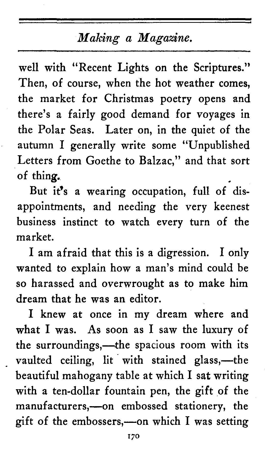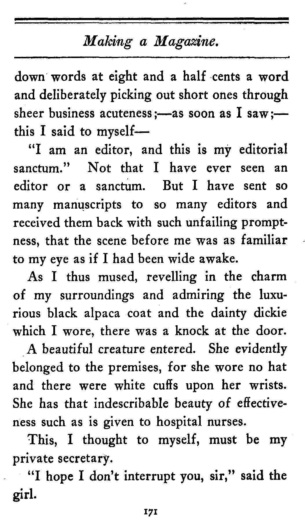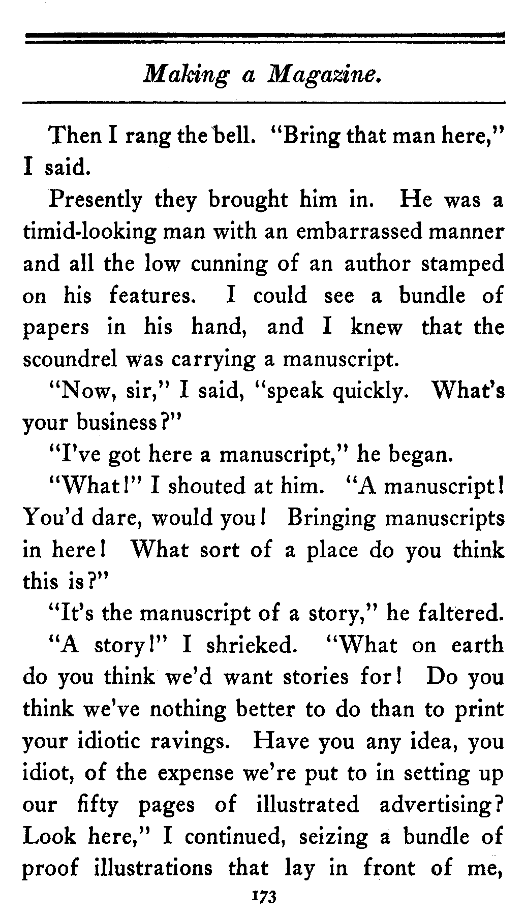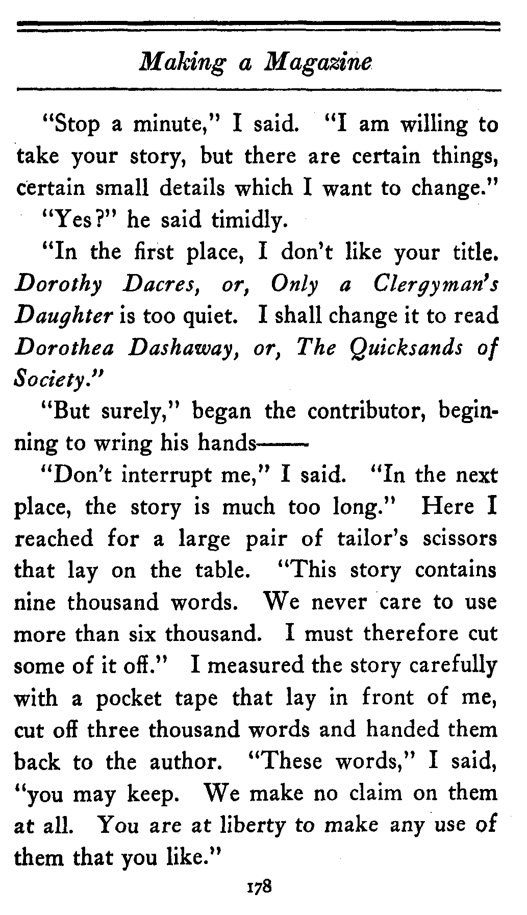 "Don't interrupt me," I said. "In the next place, the story is much too long." Here I reached for a large pair of tailor's scissors that lay on the table. "This story contains nine thousand words. We never care to use more than six thousand. I must therefore cut some of it off." I measured the story carefully with a pocket tape that lay in front of me, cut off three thousand words and handed them back to the author. "These words," I said, "you may keep. We make no claim on them at all. You are at liberty to make any use of them that you like."[179]