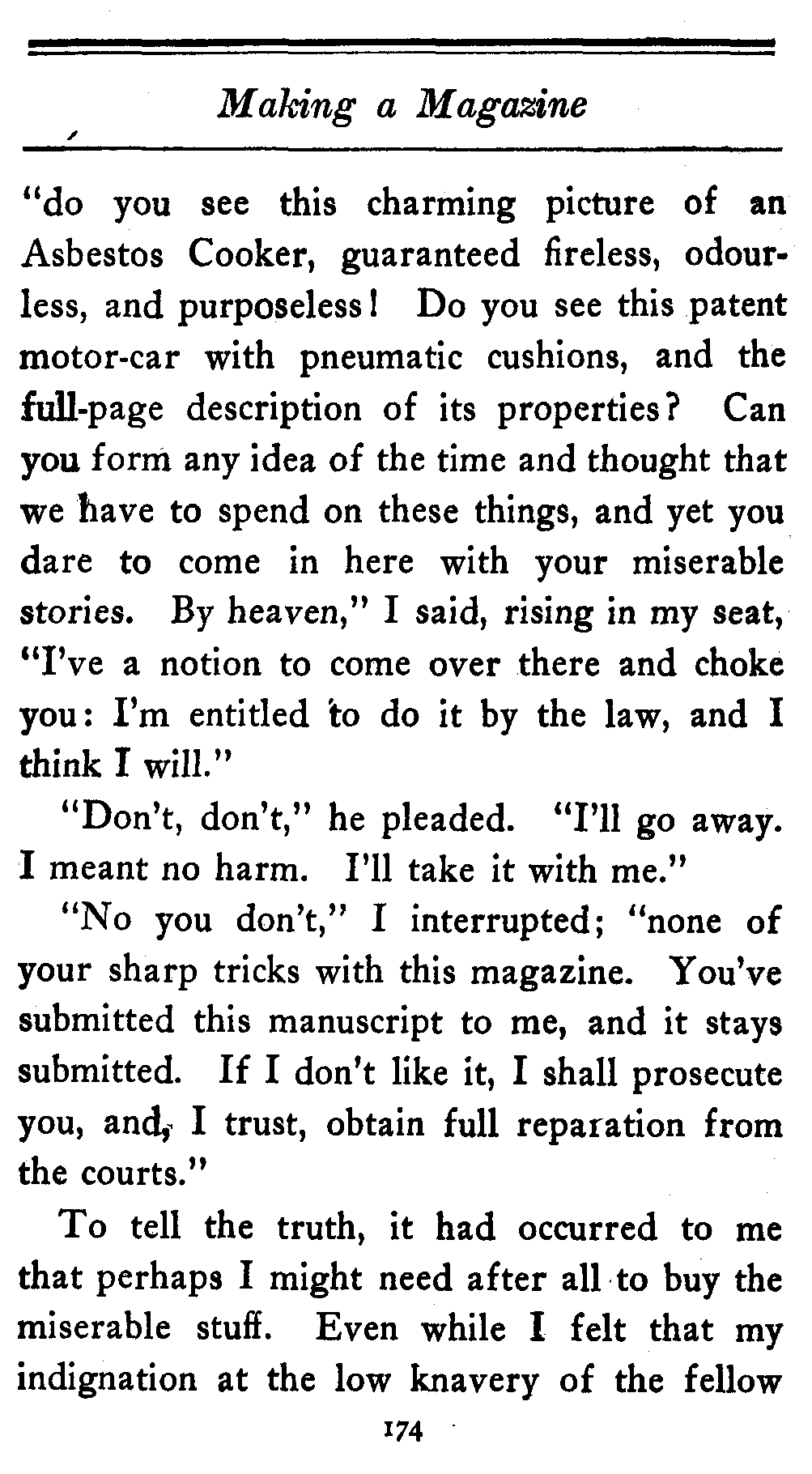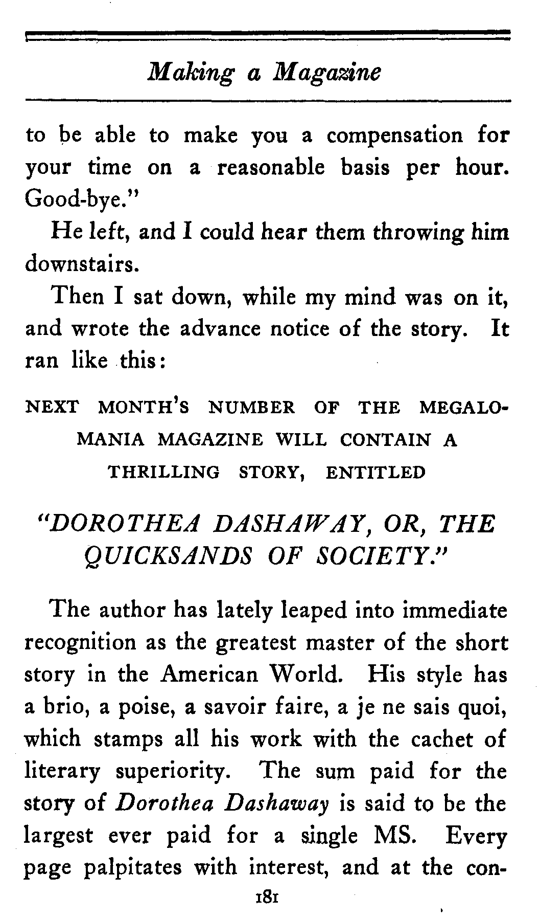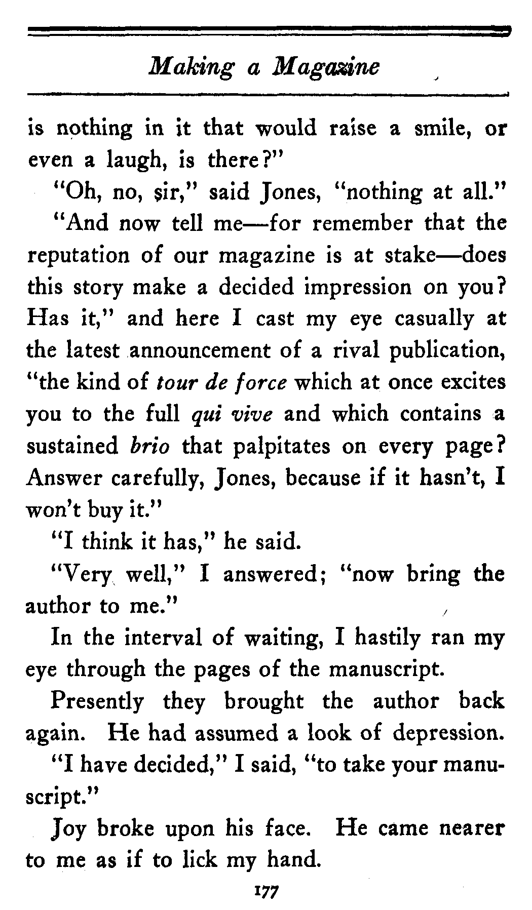"And now tell me—for remember that the reputation of our magazine is at stake—does this story make a decided impression on you? Has it," and here I cast my eye casually at the latest announcement of a rival publication, "the kind of tour de force which at once excites you to the full qui vive and which contains a sustained brio that palpitates on every page? Answer carefully, Jones, because if it hasn't, I won't buy it."