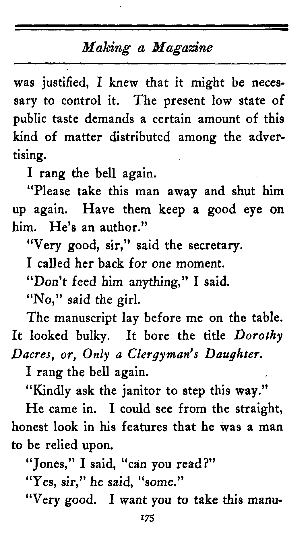 "In the first place, I don't like your title. Dorothy Dacres, or, Only a Clergyman's Daughter is too quiet. I shall change it to read Dorothea Dashaway, or, The Quicksands of Society."