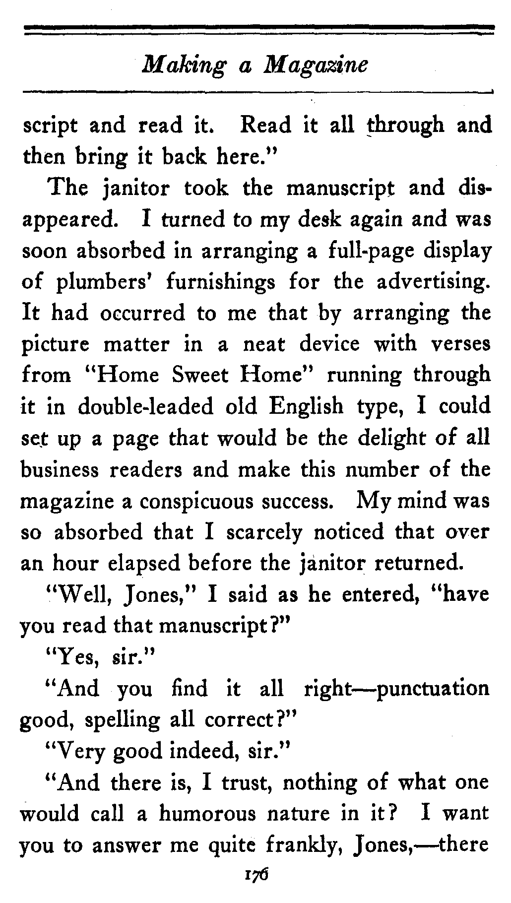 The janitor took the manuscript and disappeared. I turned to my desk again and was soon absorbed in arranging a full-page display of plumbers' furnishings for the advertising. It had occurred to me that by arranging the picture matter in a neat device with verses from "Home Sweet Home" running through it in double-leaded old English type, I could set up a page that would be the delight of all business readers and make this number of the magazine a conspicuous success. My mind was so absorbed that I scarcely noticed that over an hour elapsed before the janitor returned.
