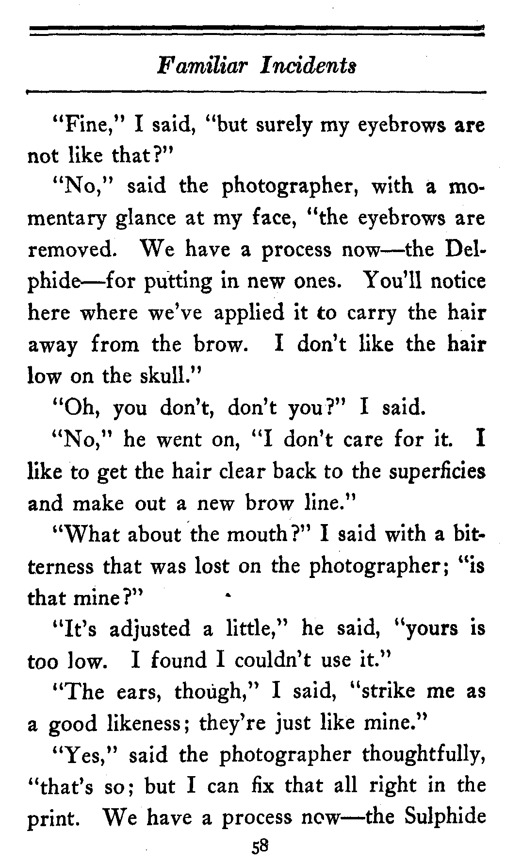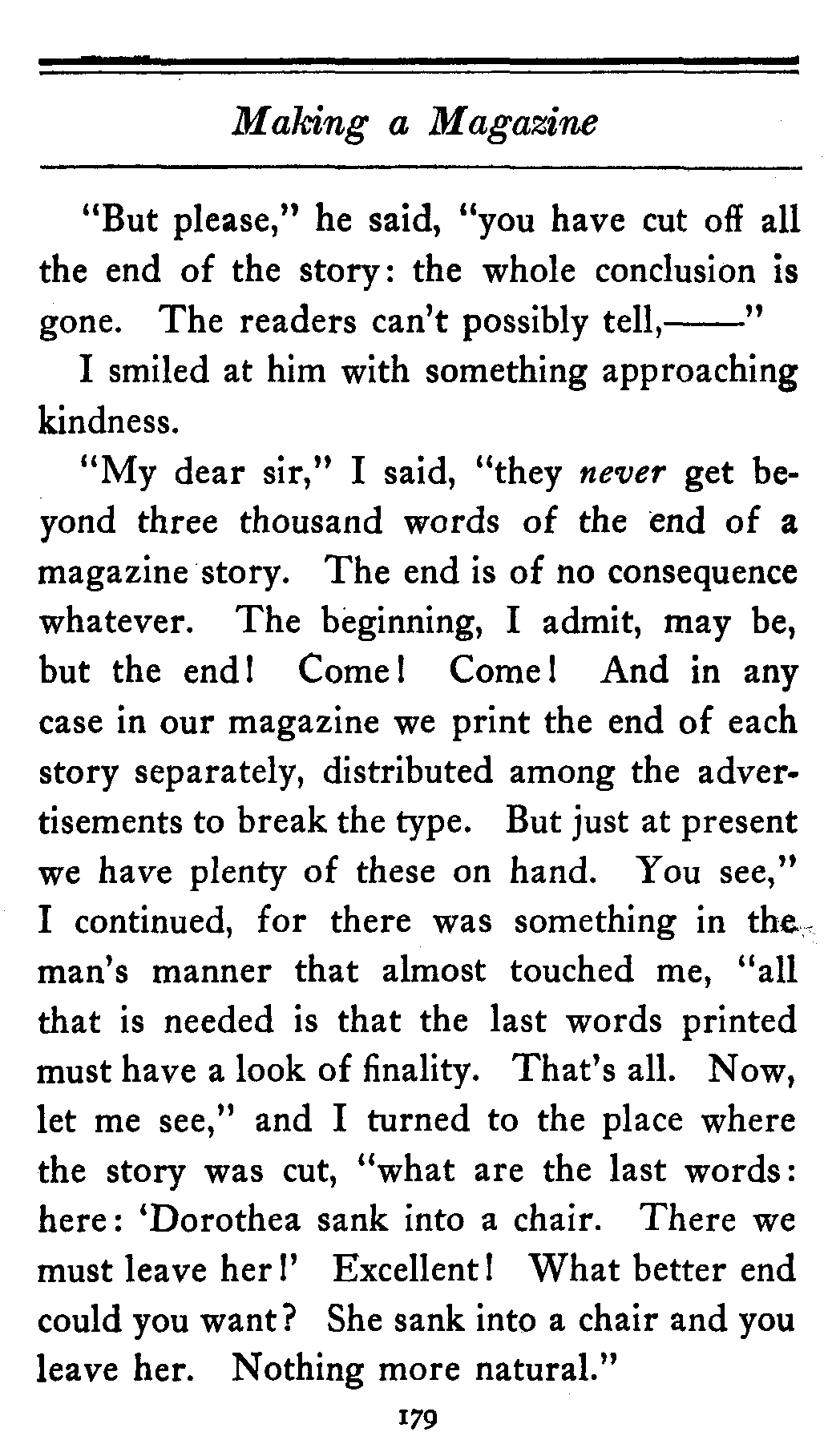 "My dear sir," I said, "they never get beyond three thousand words of the end of a magazine story. The end is of no consequence whatever. The beginning, I admit, may be, but the end! Come! Come! And in any case in our magazine we print the end of each story separately, distributed among the advertisements to break the type. But just at present we have plenty of these on hand. You see," I continued, for there was something in the man's manner that almost touched me, "all that is needed is that the last words printed must have a look of finality. That's all. Now, let me see," and I turned to the place where the story was cut, "what are the last words: here: 'Dorothea sank into a chair. There we must leave her!' Excellent! What better end could you want? She sank into a chair and you leave her. Nothing more natural."[180]