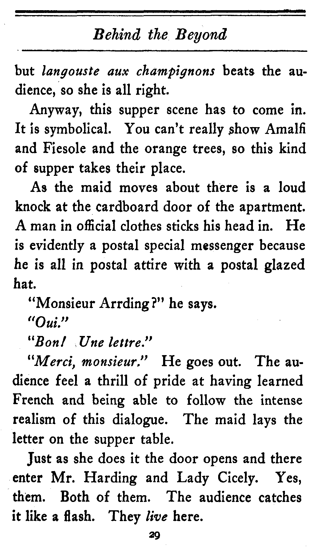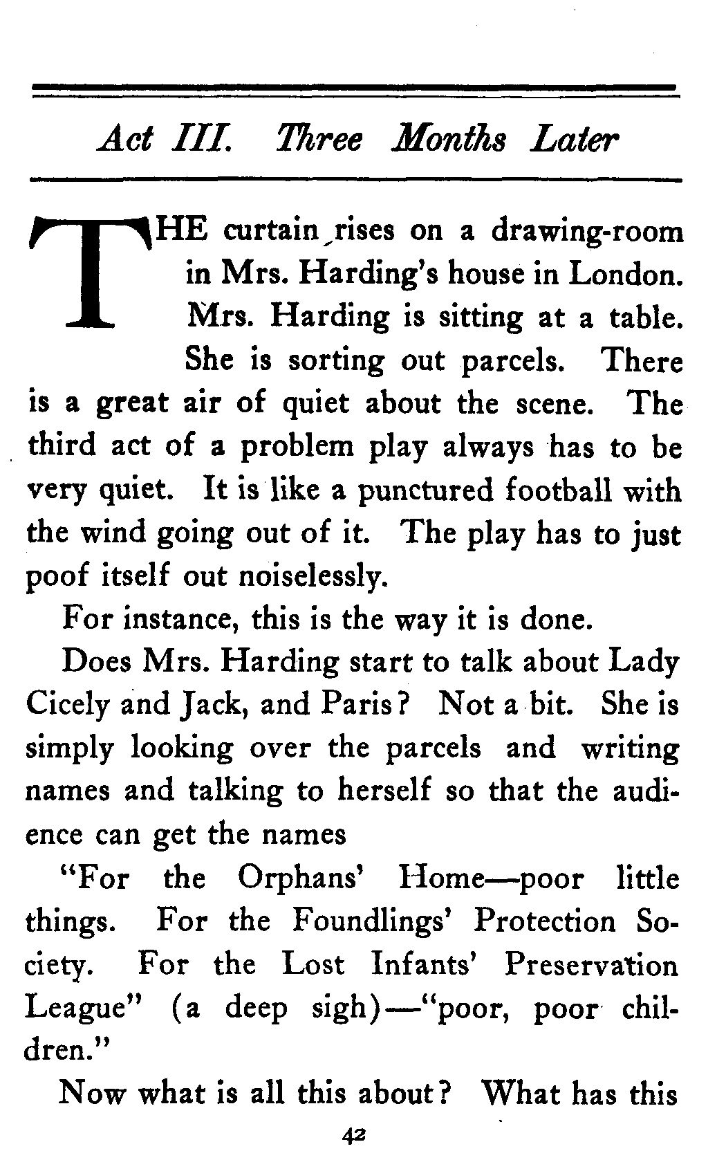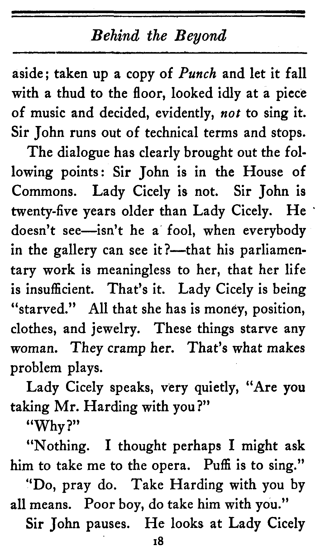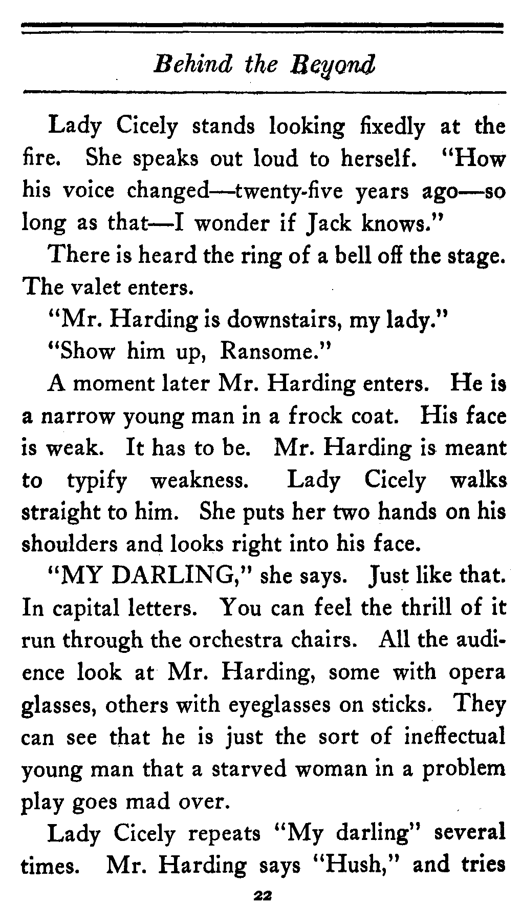 The valet bows and goes out of the cardboard door, and everybody in the theater, or at least everybody in the seats worth over a dollar, knows that there's something strange in the relations of Lady Cicely Trevor and Mr. Harding. You notice—Mr. Harding was there and no one else was there. That's enough in a problem play.