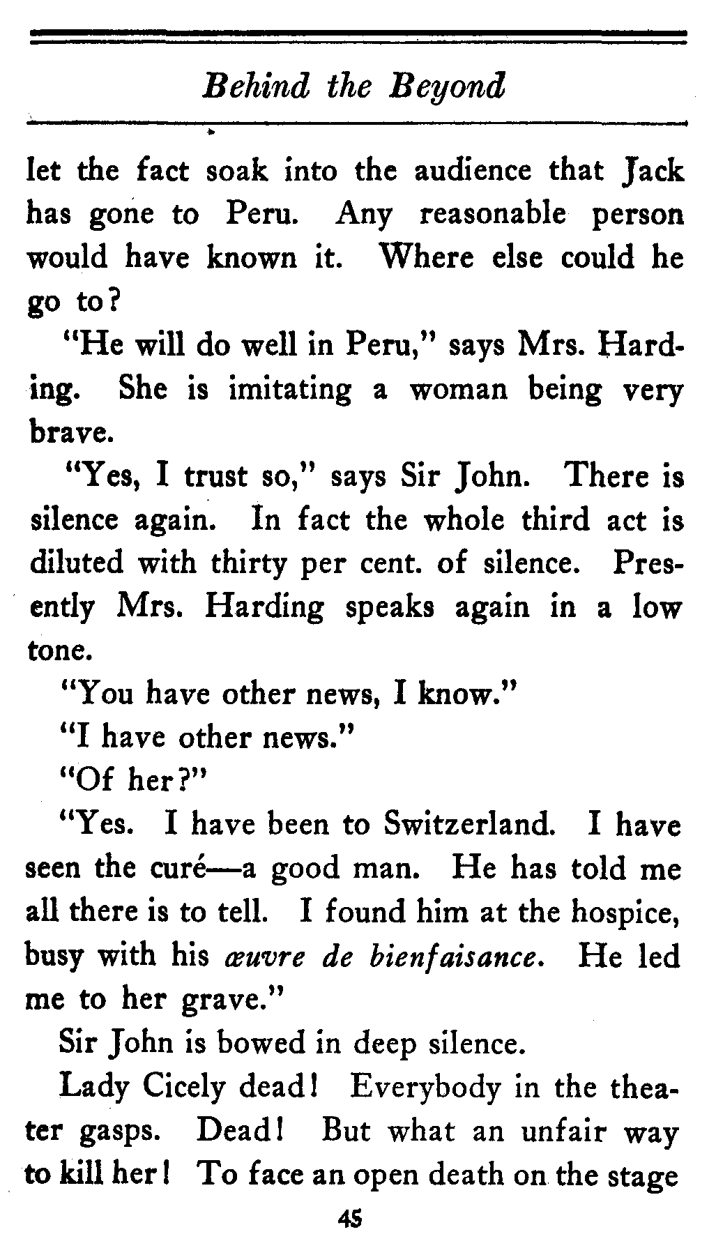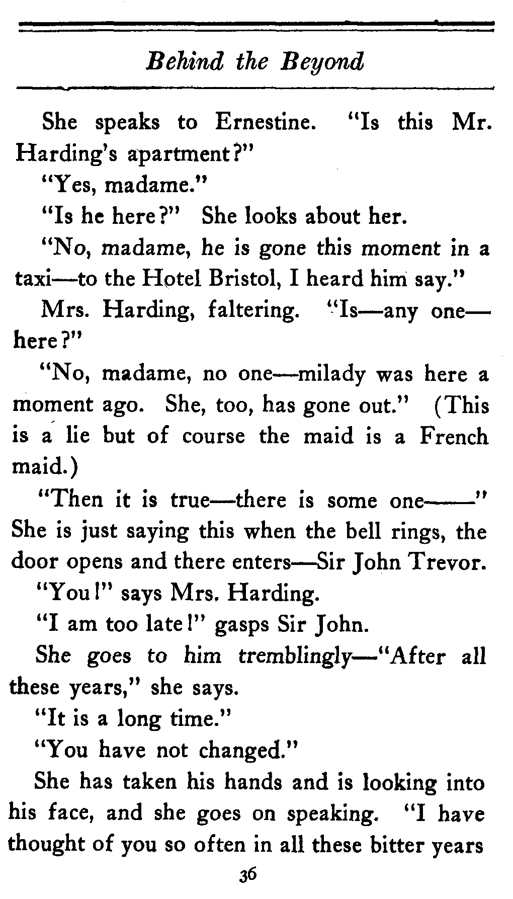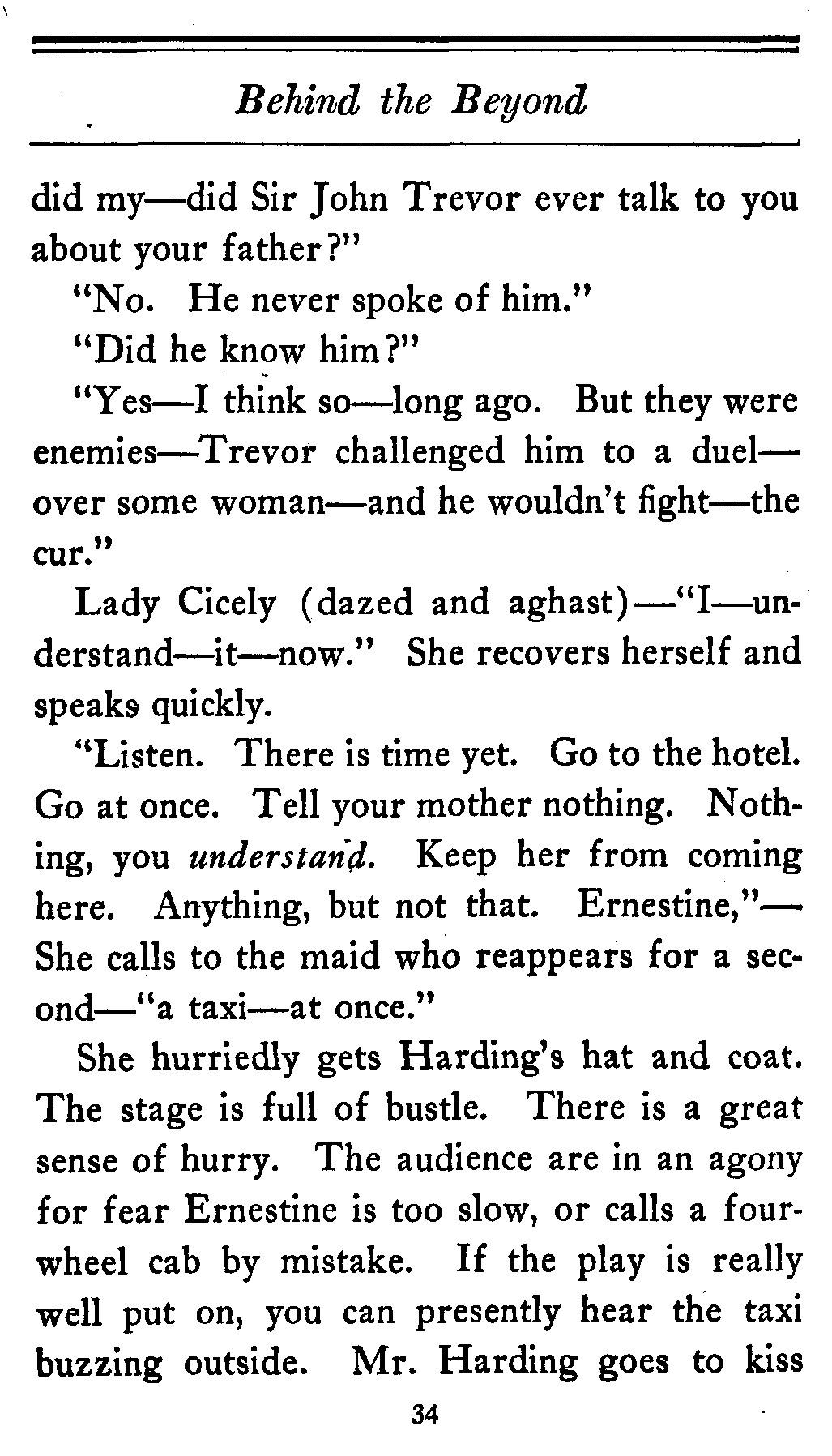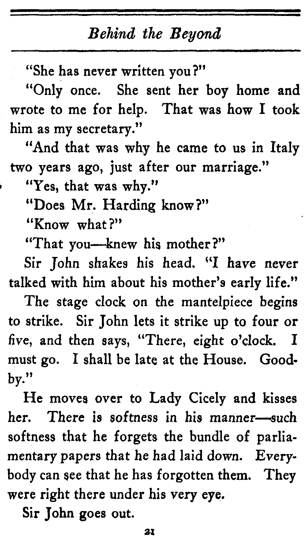 The valet bows and goes out of the cardboard door, and everybody in the theater, or at least everybody in the seats worth over a dollar, knows that there's something strange in the relations of Lady Cicely Trevor and Mr. Harding. You notice—Mr. Harding was there and no one else was there. That's enough in a problem play.