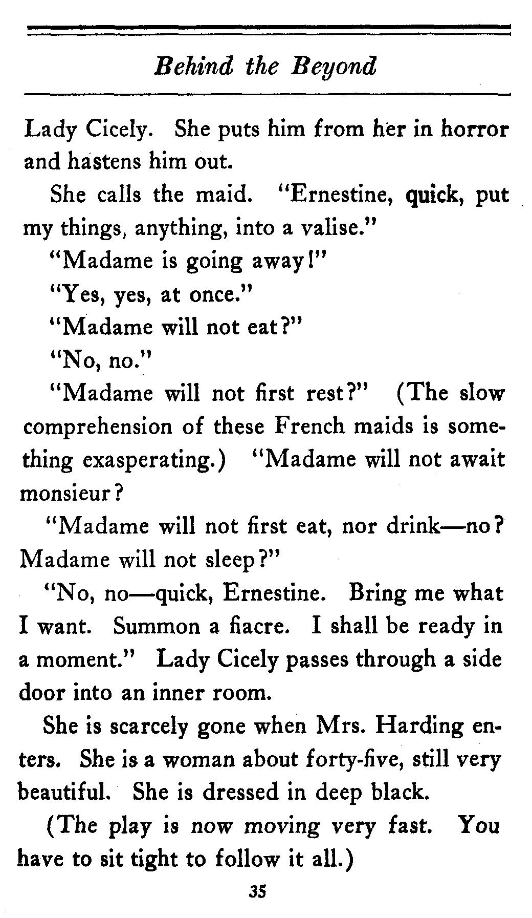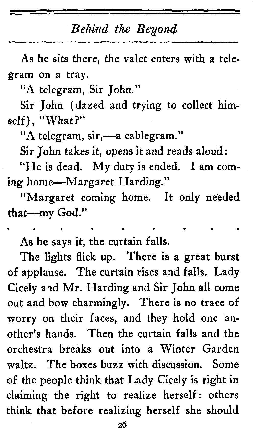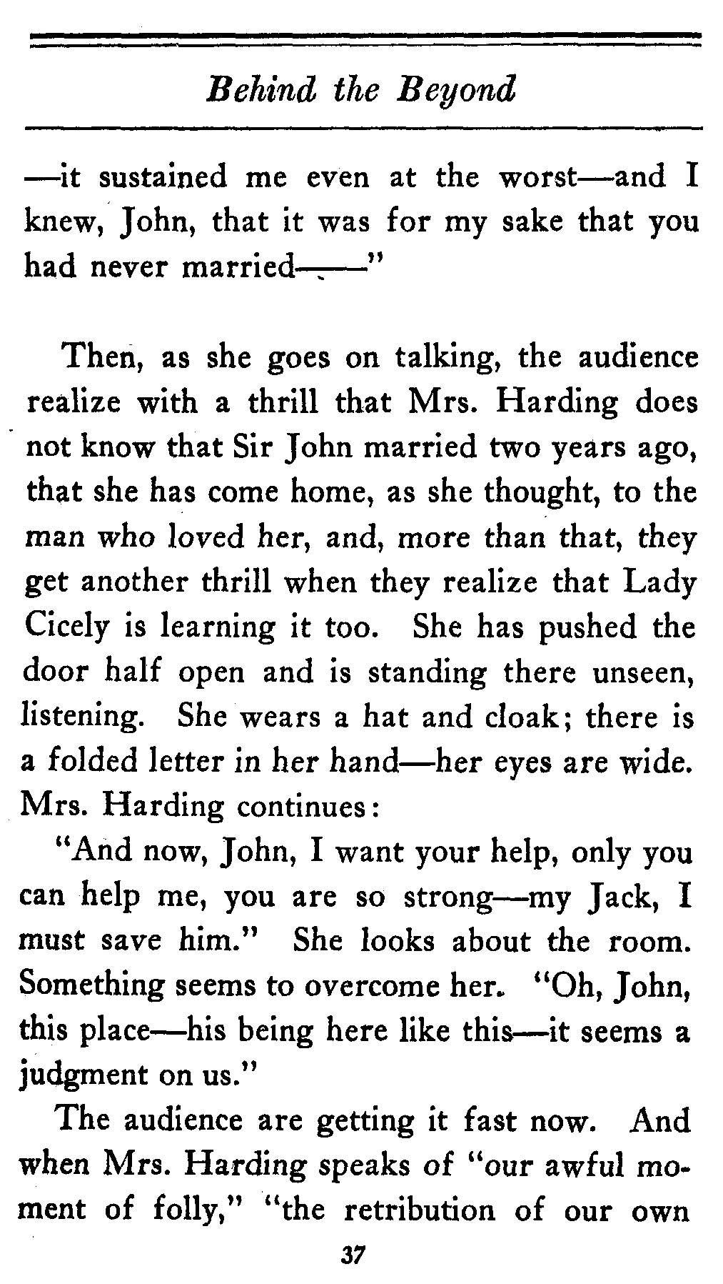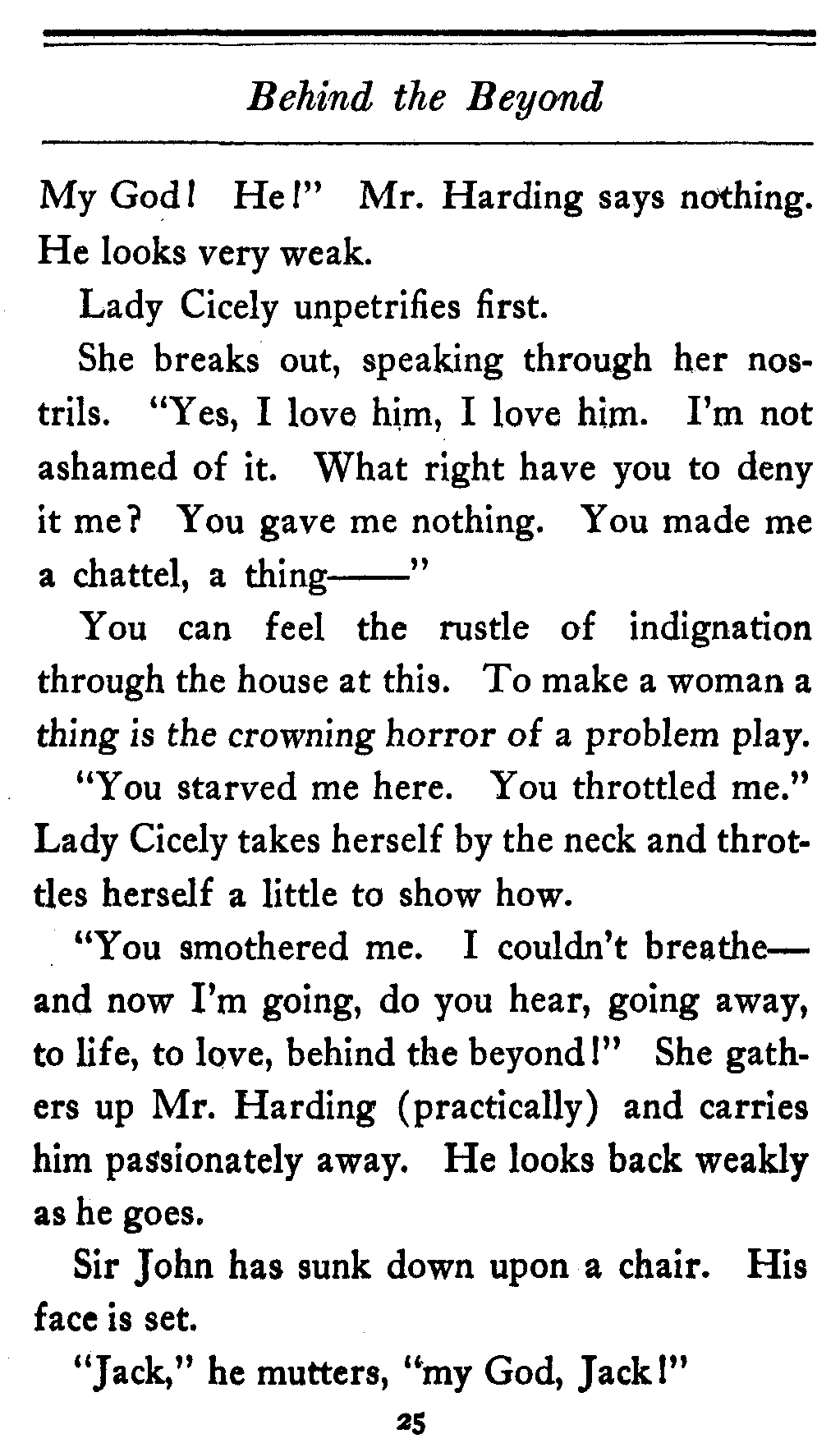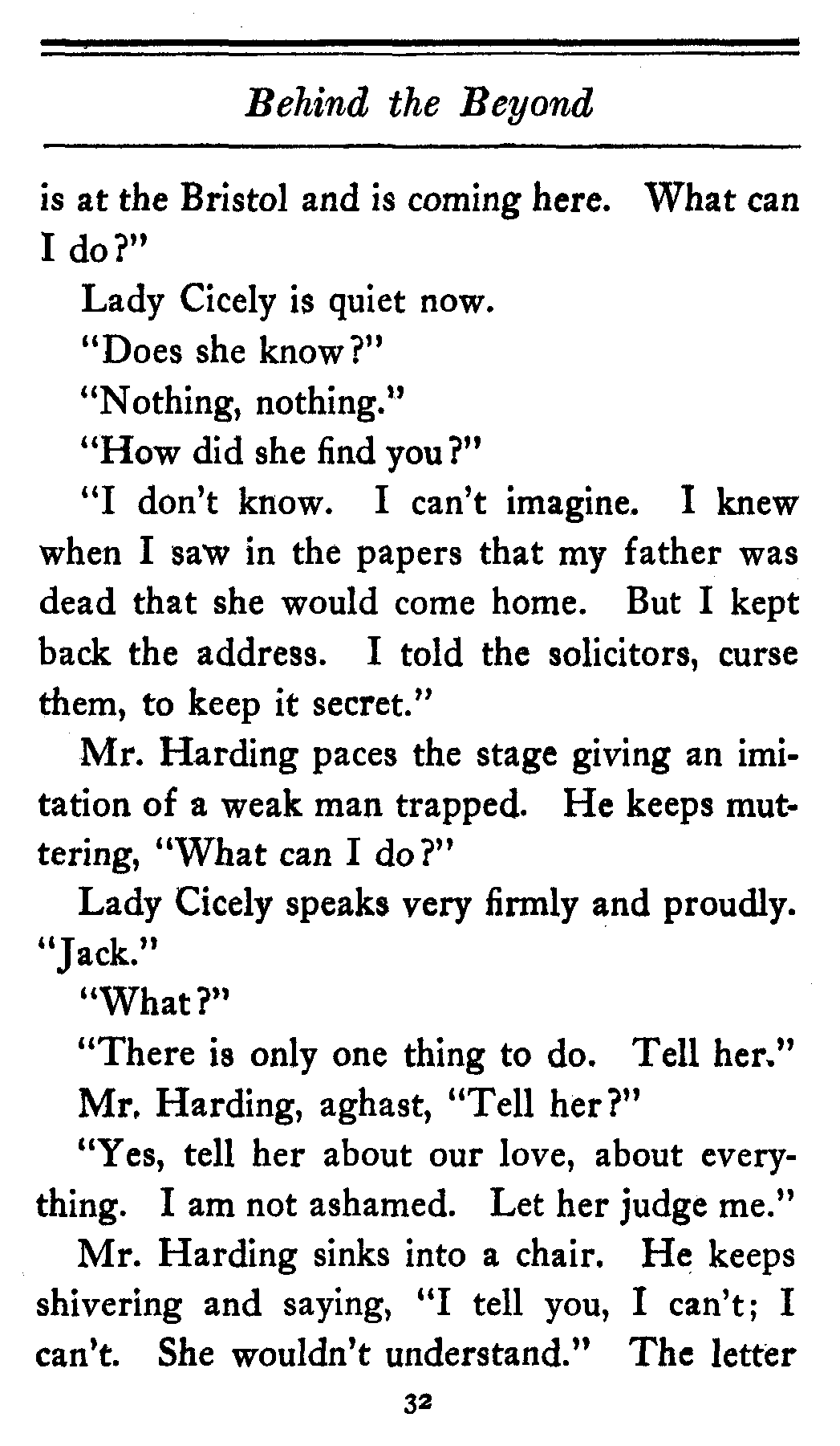 The valet bows and goes out of the cardboard door, and everybody in the theater, or at least everybody in the seats worth over a dollar, knows that there's something strange in the relations of Lady Cicely Trevor and Mr. Harding. You notice—Mr. Harding was there and no one else was there. That's enough in a problem play.