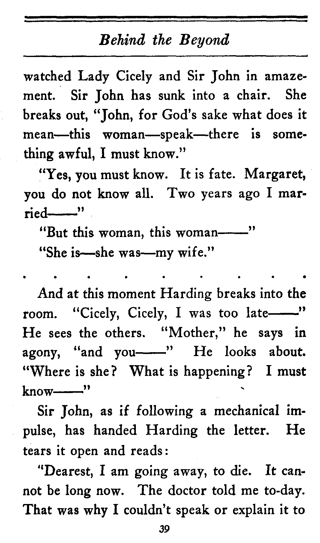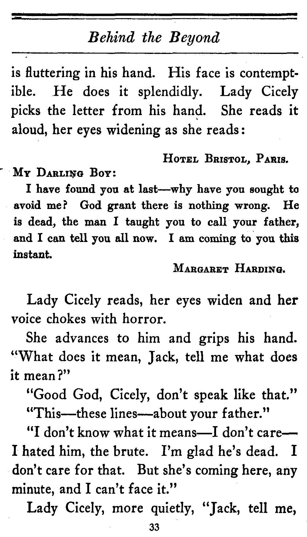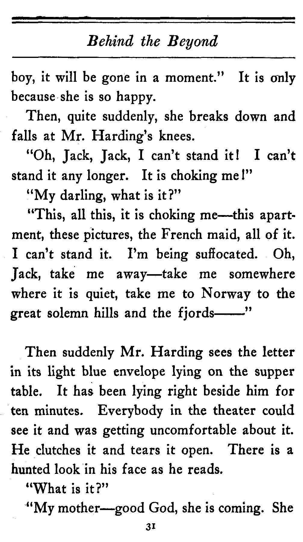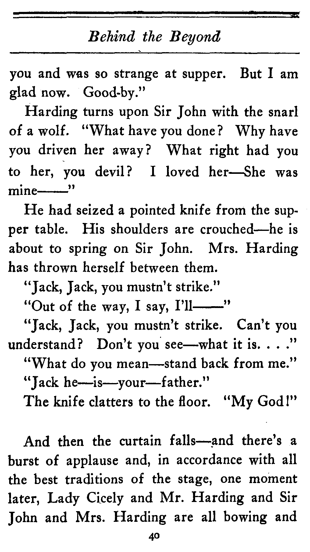 The valet bows and goes out of the cardboard door, and everybody in the theater, or at least everybody in the seats worth over a dollar, knows that there's something strange in the relations of Lady Cicely Trevor and Mr. Harding. You notice—Mr. Harding was there and no one else was there. That's enough in a problem play.