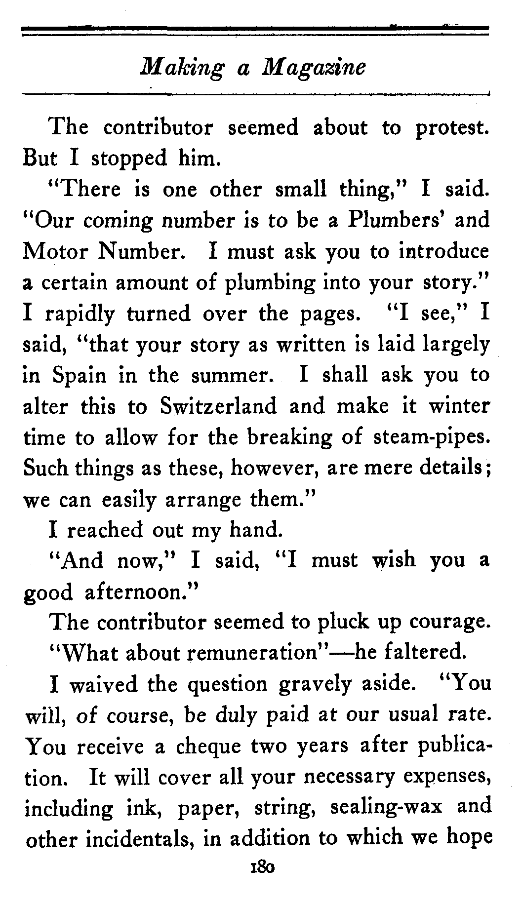 "There is one other small thing," I said. "Our coming number is to be a Plumbers' and Motor Number. I must ask you to introduce a certain amount of plumbing into your story." I rapidly turned over the pages. "I see," I said, "that your story as written is laid largely in Spain in the summer. I shall ask you to alter this to Switzerland and make it winter time to allow for the breaking of steam-pipes. Such things as these, however, are mere details; we can easily arrange them."