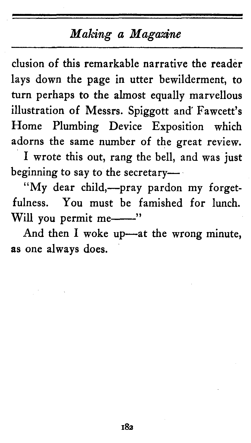 The author has lately leaped into immediate recognition as the greatest master of the short story in the American World. His style has a brio, a poise, a savoir faire, a je ne sais quoi, which stamps all his work with the cachet of literary superiority. The sum paid for the story of Dorothea Dashaway is said to be the largest ever paid for a single MS. Every page palpitates with interest, and at the con[182]clusion of this remarkable narrative the reader lays down the page in utter bewilderment, to turn perhaps to the almost equally marvellous illustration of Messrs. Spiggott and Fawcett's Home Plumbing Device Exposition which adorns the same number of the great review.