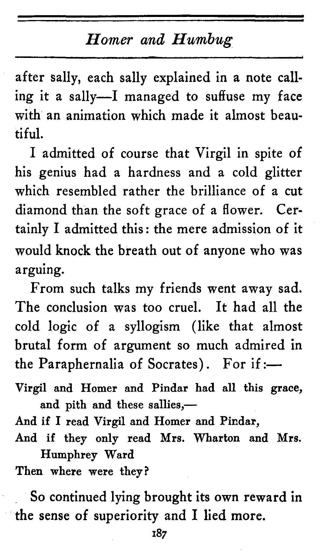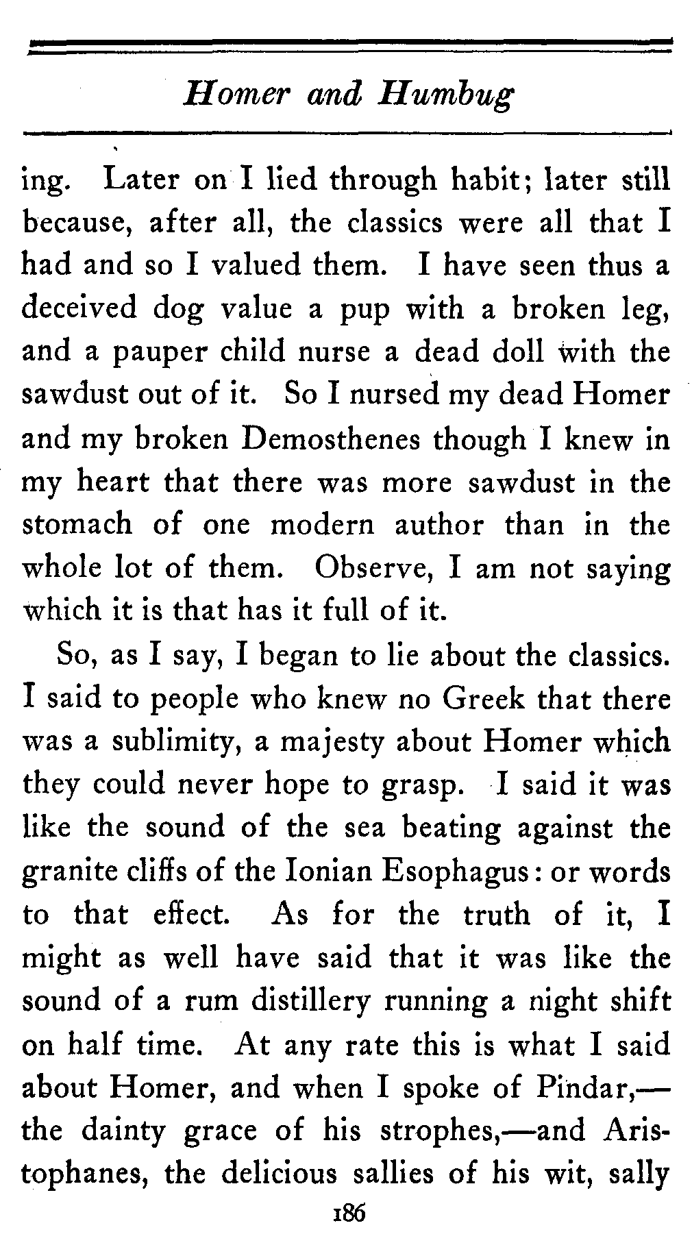 So, as I say, I began to lie about the classics. I said to people who knew no Greek that there was a sublimity, a majesty about Homer which they could never hope to grasp. I said it was like the sound of the sea beating against the granite cliffs of the Ionian Esophagus: or words to that effect. As for the truth of it, I might as well have said that it was like the sound of a rum distillery running a night shift on half time. At any rate this is what I said about Homer, and when I spoke of Pindar,—the dainty grace of his strophes,—and Aristophanes, the delicious sallies of his wit, sally[187] after sally, each sally explained in a note calling it a sally—I managed to suffuse my face with an animation which made it almost beautiful.