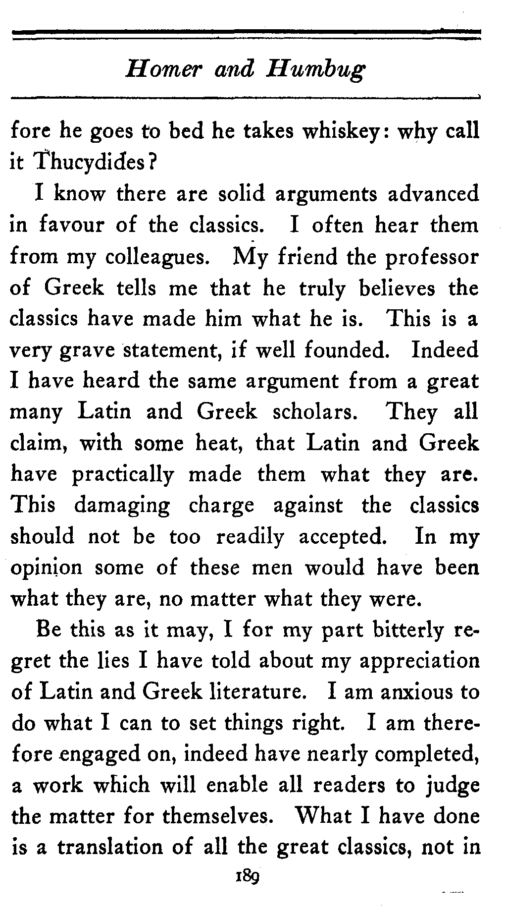 I believe all scholars lie like this. An ancient friend of mine, a clergyman, tells me that in Hesiod he finds a peculiar grace that he doesn't find elsewhere. He's a liar. That's all. Another man, in politics and in the legislature, tells me that every night before going to bed he reads over a page or two of Thucydides to keep his mind fresh. Either he never goes to bed or he's a liar. Doubly so: no one could read Greek at that frantic rate: and anyway his mind isn't fresh. How could it be, he's in the legislature. I don't object to this man talking freely of the classics, but he ought to keep it for the voters. My own opinion is that be[189]fore he goes to bed he takes whiskey: why call it Thucydides?