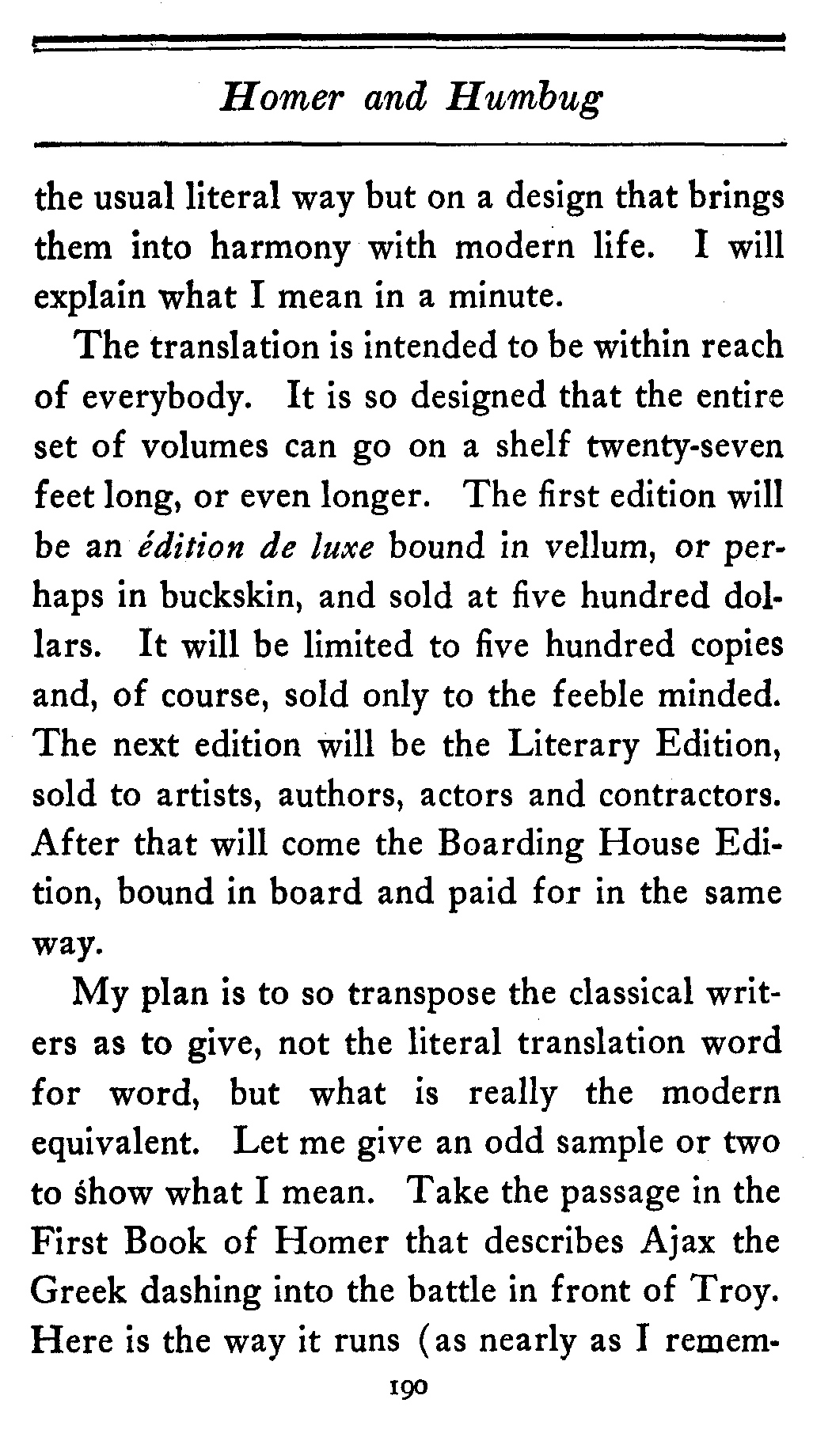 The translation is intended to be within reach of everybody. It is so designed that the entire set of volumes can go on a shelf twenty-seven feet long, or even longer. The first edition will be an édition de luxe bound in vellum, or perhaps in buckskin, and sold at five hundred dollars. It will be limited to five hundred copies and, of course, sold only to the feeble minded. The next edition will be the Literary Edition, sold to artists, authors, actors and contractors. After that will come the Boarding House Edition, bound in board and paid for in the same way.