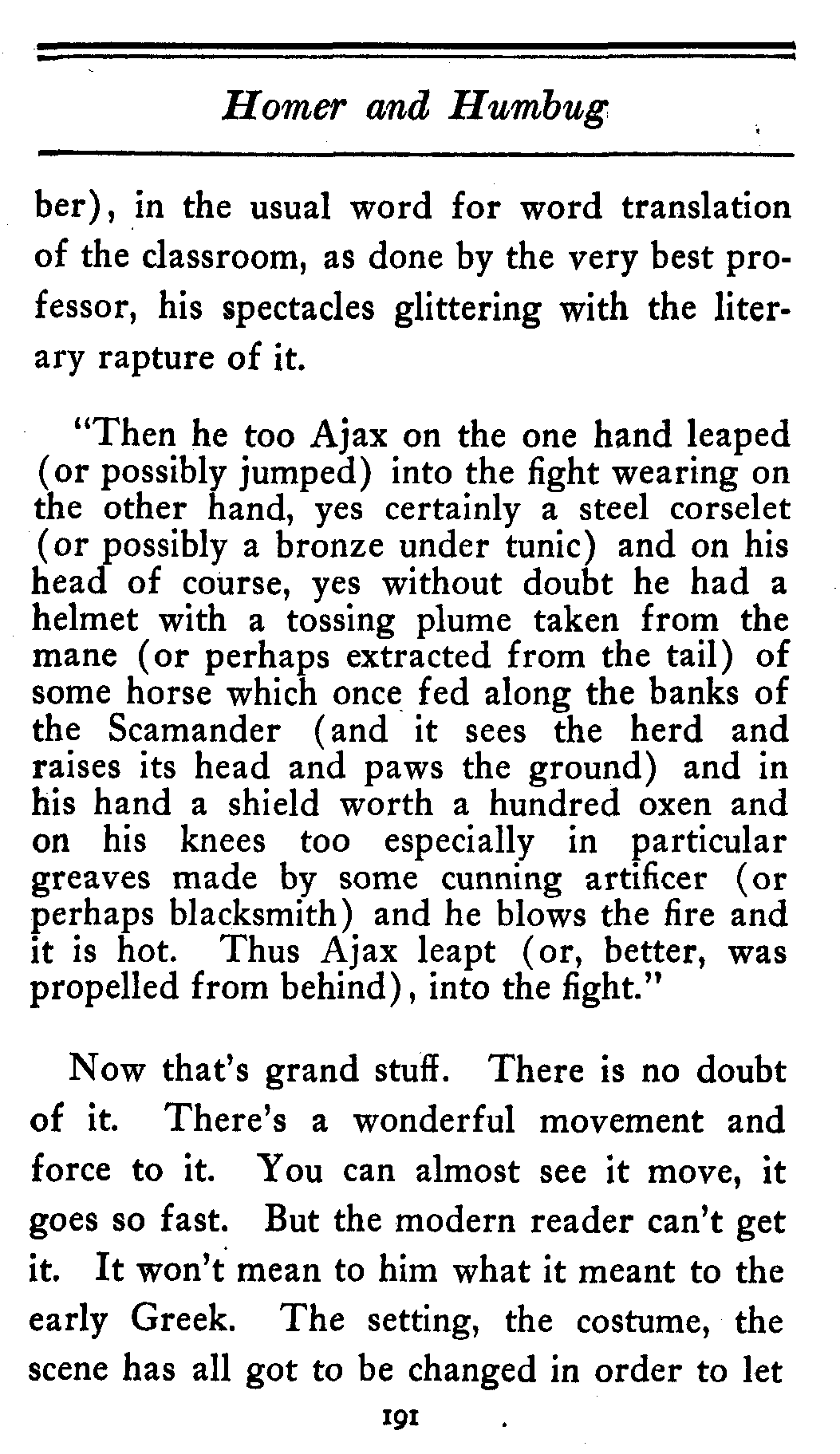 My plan is to so transpose the classical writers as to give, not the literal translation word for word, but what is really the modern equivalent. Let me give an odd sample or two to show what I mean. Take the passage in the First Book of Homer that describes Ajax the Greek dashing into the battle in front of Troy. Here is the way it runs (as nearly as I remem[191]ber), in the usual word for word translation of the classroom, as done by the very best professor, his spectacles glittering with the literary rapture of it.
