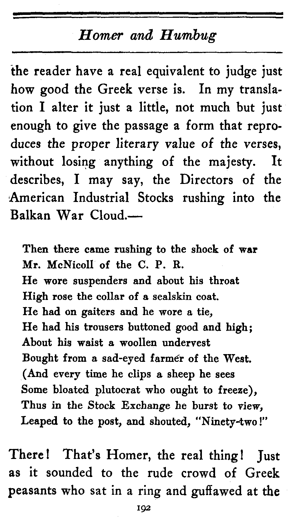 Now that's grand stuff. There is no doubt of it. There's a wonderful movement and force to it. You can almost see it move, it goes so fast. But the modern reader can't get it. It won't mean to him what it meant to the early Greek. The setting, the costume, the scene has all got to be changed in order to let[192] the reader have a real equivalent to judge just how good the Greek verse is. In my translation I alter it just a little, not much but just enough to give the passage a form that reproduces the proper literary value of the verses, without losing anything of the majesty. It describes, I may say, the Directors of the American Industrial Stocks rushing into the Balkan War Cloud.—