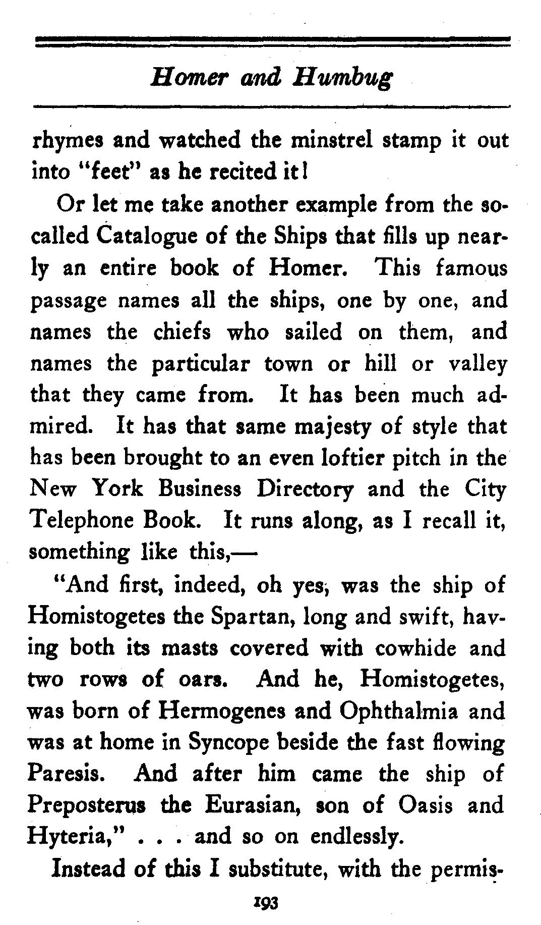 Or let me take another example from the so-called Catalogue of the Ships that fills up nearly an entire book of Homer. This famous passage names all the ships, one by one, and names the chiefs who sailed on them, and names the particular town or hill or valley that they came from. It has been much admired. It has that same majesty of style that has been brought to an even loftier pitch in the New York Business Directory and the City Telephone Book. It runs along, as I recall it, something like this,—