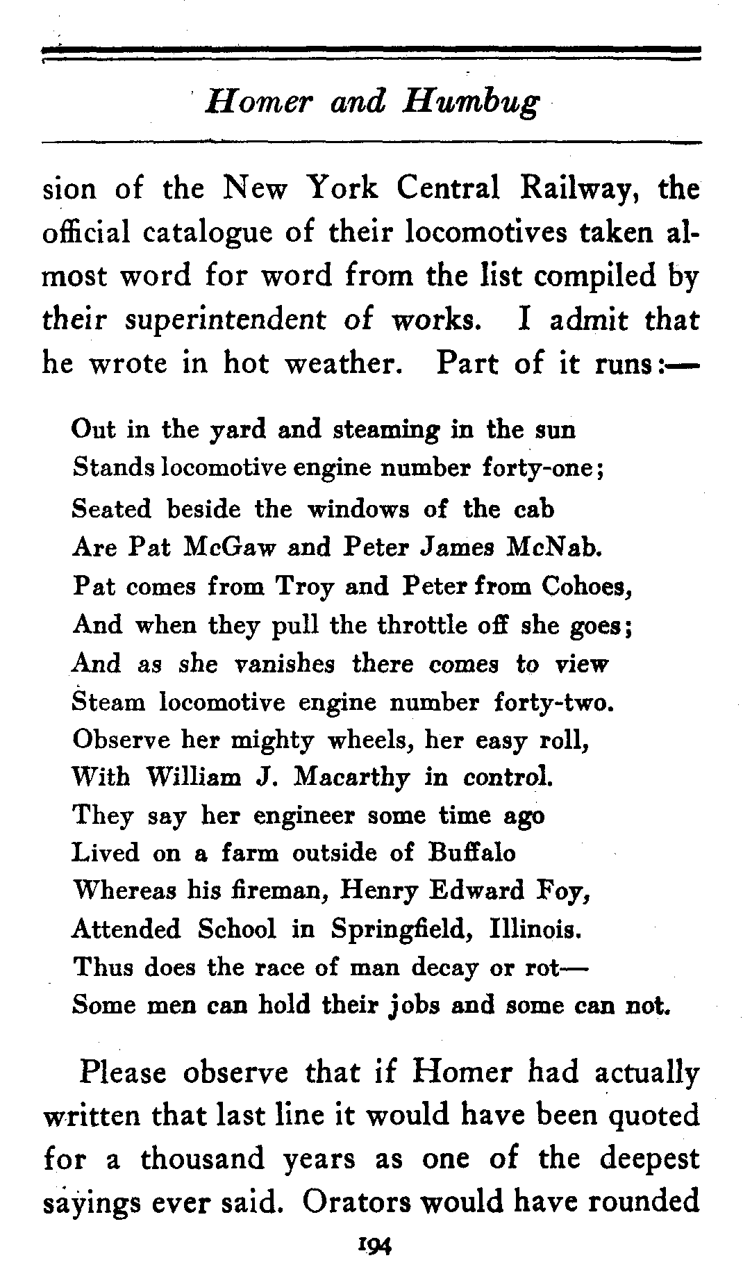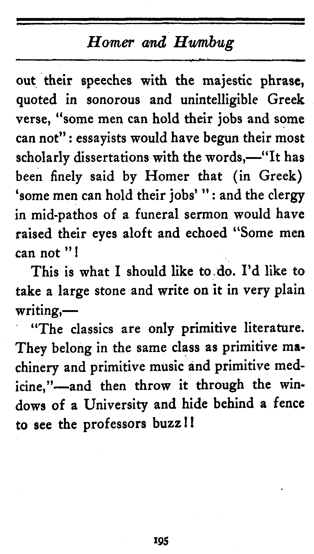 Please observe that if Homer had actually written that last line it would have been quoted for a thousand years as one of the deepest sayings ever said. Orators would have rounded[195] out their speeches with the majestic phrase, quoted in sonorous and unintelligible Greek verse, "some men can hold their jobs and some can not": essayists would have begun their most scholarly dissertations with the words,—"It has been finely said by Homer that (in Greek) 'some men can hold their jobs'": and the clergy in mid-pathos of a funeral sermon would have raised their eyes aloft and echoed "Some men can not"!
