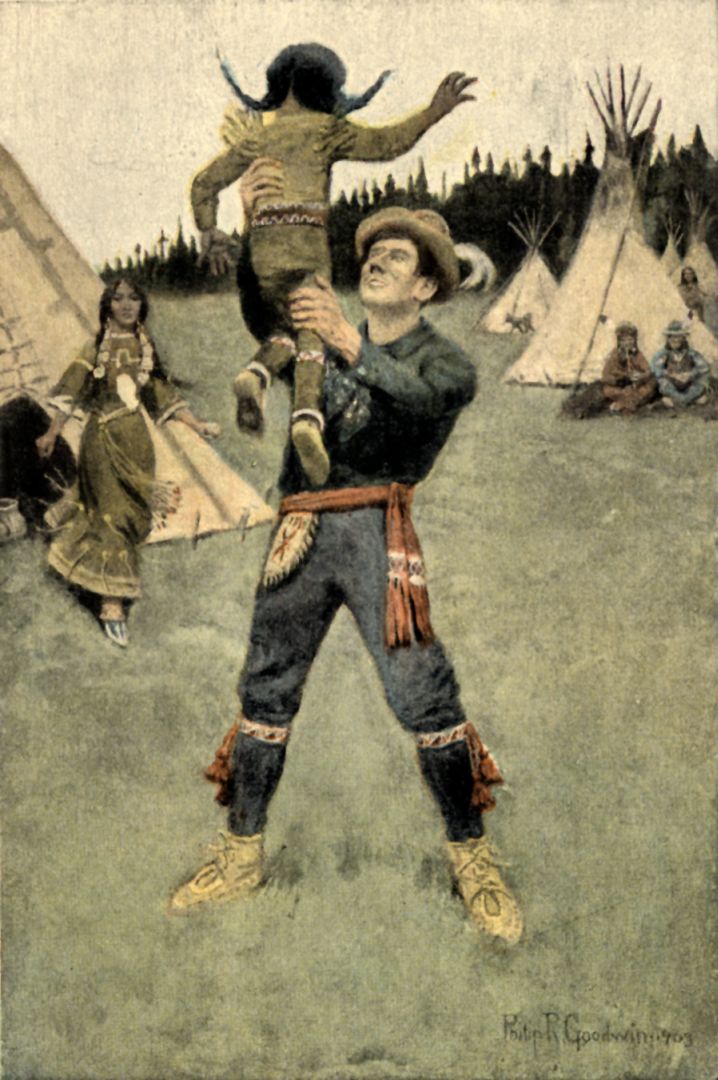 His companion was hardly more than a boy in years, though more than a man in physical development. In every respect he seemed to be especially adapted to the rigours of northern life. The broad arch of his chest, the plump smoothness of his muscles, above all, the full roundness of his throat indicated that warmth-giving blood, and plenty of it, would be pumped generously to every part of his body. His face from any point of view but one revealed a handsome, jaunty boy, whose beard was still a shade. But when he looked at one directly, the immaturity fell away. This might have been because of a certain confidence of experience beyond what most boys of twenty can know, or it might have been the result merely of a physical peculiarity. For his eyes were so extraordinarily close together that they seemed by their very proximity to pinch the bridge of his nose, and in addition, they possessed a queer slant or cast which twinkled perpetually now in one, now in the other. It invested him at once with an air singularly remote and singularly determined. But at once when he looked away the old boyishness returned, enhanced further by a certain youthful barbarity in the details of his dress—a slanted heron's feather in his hat, a beaded knife-sheath, an excess of ornamentation on his garters and moccasins, and the like.