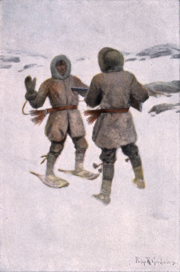 In the distance Dick seemed to make out an object moving. As he had so often done before, by an effort he brought his eyes to focus, expecting, as also had happened so often before, that the object would disappear. But it persisted, black against the snow. Its outlines could not be guessed; its distance could not be estimated, its direction of travel could not be determined. Only the bare fact of its existence was sure. Somewhere out in the waste it, moving, antithesised these other three black masses on the whiteness, the living man, the living animal, the dead girl.