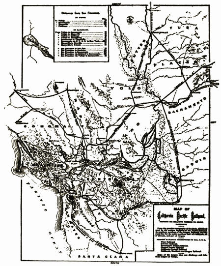 | Map showing the line of the San Francisco and San Joaquin Valley Railway, together with portions of the systems of the Southern Pacific and of the Atchison, Topeka and Santa Fé, 1898 | 325 | |