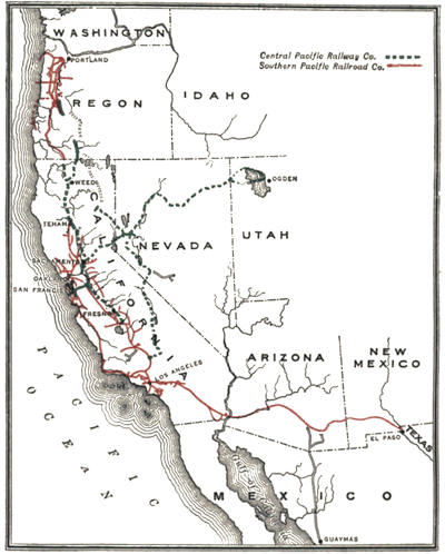The history of the Southern Pacific is significant, however, for still other reasons than because it illustrates what men can do in spite of serious difficulties. The company’s record is important to the student of transportation problems because there is embodied in it much of the experience of the Pacific Coast with respect to railroad construction, railroad finance, railroad rate-making, and the relation of railroad corporations to the public at large, as represented by local, state, and national governments. What the Pacific Coast, and what in particular the state of California know, first hand, of the habits and[4] policies of railroad corporations, is mainly derived from contact with the Southern Pacific Railroad and its auxiliary companies.