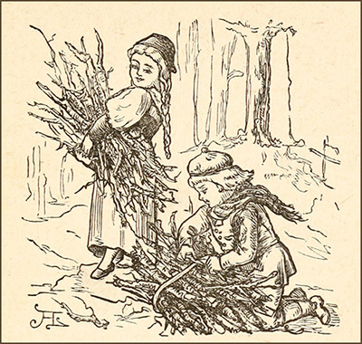 This afternoon, in spite of the cold, they are out gathering wood, of which the Ranger allows them all they need to use. There is a pile at home already, almost as high as the cottage roof: but Thekla is resolved that her fire shall always be bright when Max and the Grandfather come in from out-doors, blue and cold; and she isn’t satisfied yet. For hours they have been at work, and have tied ever so many fagots. The merry winds have been helping in the task, tearing boughs and twigs off overhead, and throwing them down upon the path, so that the bundles have collected rapidly, and wise little Thekla says, “This has been a good day.”