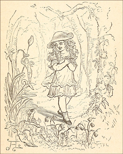 There were two great jars standing there, which seemed to hold the stuff out of which the figures were made. The children peeped in. One was full of a marvelous kind of water, sparkling and golden and bubbling like wine. The other held sand, or what seemed like sand,—fine, glittering particles,—most beautiful to see. It was wonderful to watch the old man work. His lean fingers would twist and mold the sand and water for a second, and there would be a lovely head, an arm, or a garland of flowers. The forms grew like magic; and the children were so charmed with watching,11 that they forgot either to speak or to go away.