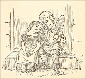 Just then a naughty idea entered into Max’s head. “We’ll see whether that is true,” he muttered;14 and, watching till the old man’s back was turned, he plunged his fingers into the jar, stole a double handful of the sand, and hid it in the tin can which was slung to his side, and in which his dinner and Thekla’s had been. Old Time was too busy to heed him. Pretty soon after, Max took Thekla’s hand, and, without saying “Good-by,” dragged her away down the narrow path towards home. It was almost nightfall when at last they got there.