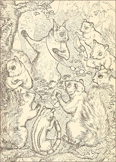 “They used to lie all curled up in a heap,” continued February, “at the bottom of a nest in the rocks, which their mother had lined with leaves and moss to keep them warm. They looked just like funny bundles of brown hair. There were four of them,—Snap, Snooze, Roll-about, and Greedy. Roll-about was the fattest and the best-natured, but they were all nice. They lay tangled together, and couldn’t help pulling each other’s fur a good deal; but they quarrelled much less than most brothers and sisters who live in such close quarters.