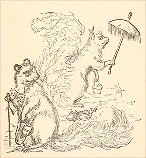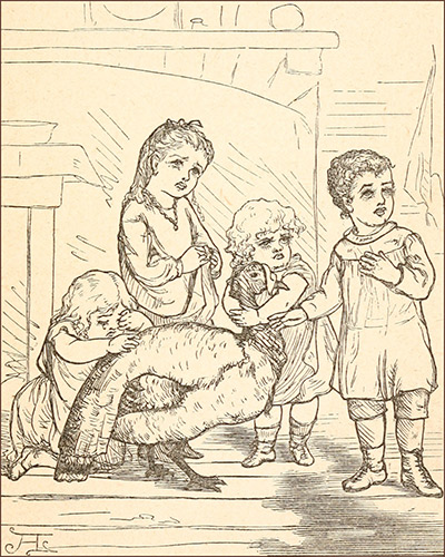 “When asked how he managed to get back, Greedy explained it in this way: ‘He was travelling,’ he said, ‘with some friends. They were in a cage together, which was the fashionable way of going about just now. By an accident, the cage upset and some of the bars broke; and,26 as it was so near home, Greedy thought he might as well run over, and make them a visit.’ All this he said with a lofty air, and the brothers and sister believed every word of it; but Mamma put her tongue in her cheek, and gently pointed over her left shoulder with her paw.