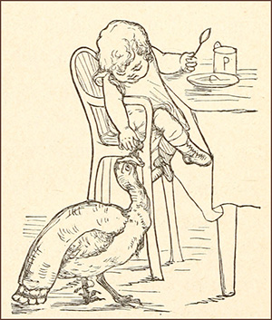 “Greedy froze him with a look. He didn’t answer,25 but went on with his tale. He had learned to dance. He could pick out the Ace of Hearts, and A, B, and Z from the alphabet. He could jump over a stick. This last he did on the spot, to show them how it went; and, in the middle of the jump, Snap noticed something which made him cry out, ‘O Greedy! your poor paws! What is the matter with them? They’re all brown, and dried up?’