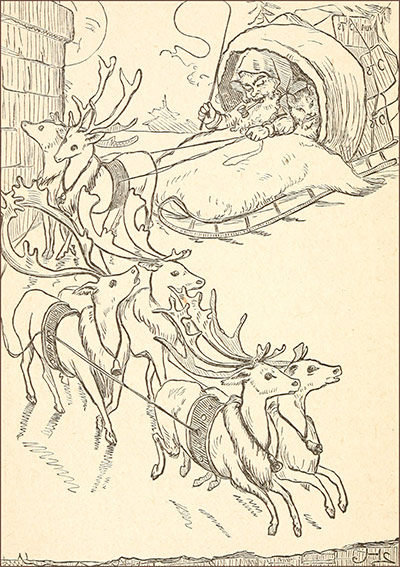 “Off they went, the magic stillness of the flight broken only by the tinkling bells. First one chimney, then another; bag after bag full of toys and sweets; here a doll, there a diamond ring, here only a pair of warm stockings. Everybody had something, except in a few houses over whose roofs St. Nicholas paused a moment with a look half sad, half angry, and left nothing. People lived there who knew him little, and loved him less.