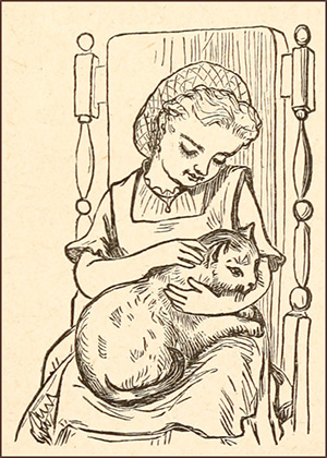“Puss stood bewildered. Were her night’s adventures a dream? Had she ever studied geography, she might have guessed that chasing morning round the world is a sure way to lose your reckoning. As it was, she could only venture on a plaintive, inquiring ‘Mew?’ Hunger was more engrossing than curiosity. She devoured breakfast, dinner, supper, all at once. The Stepmother had more reason than ever when she grumbled at being ‘eaten out of house and home by a beast.’ But Gretchen’s tears the day221 before had so moved her Father, that he took courage to declare that Puss must be restored to her former privileges. Warm corner, dainty mess, and the protecting arms of her little mistress became hers again, and are hers to this day.