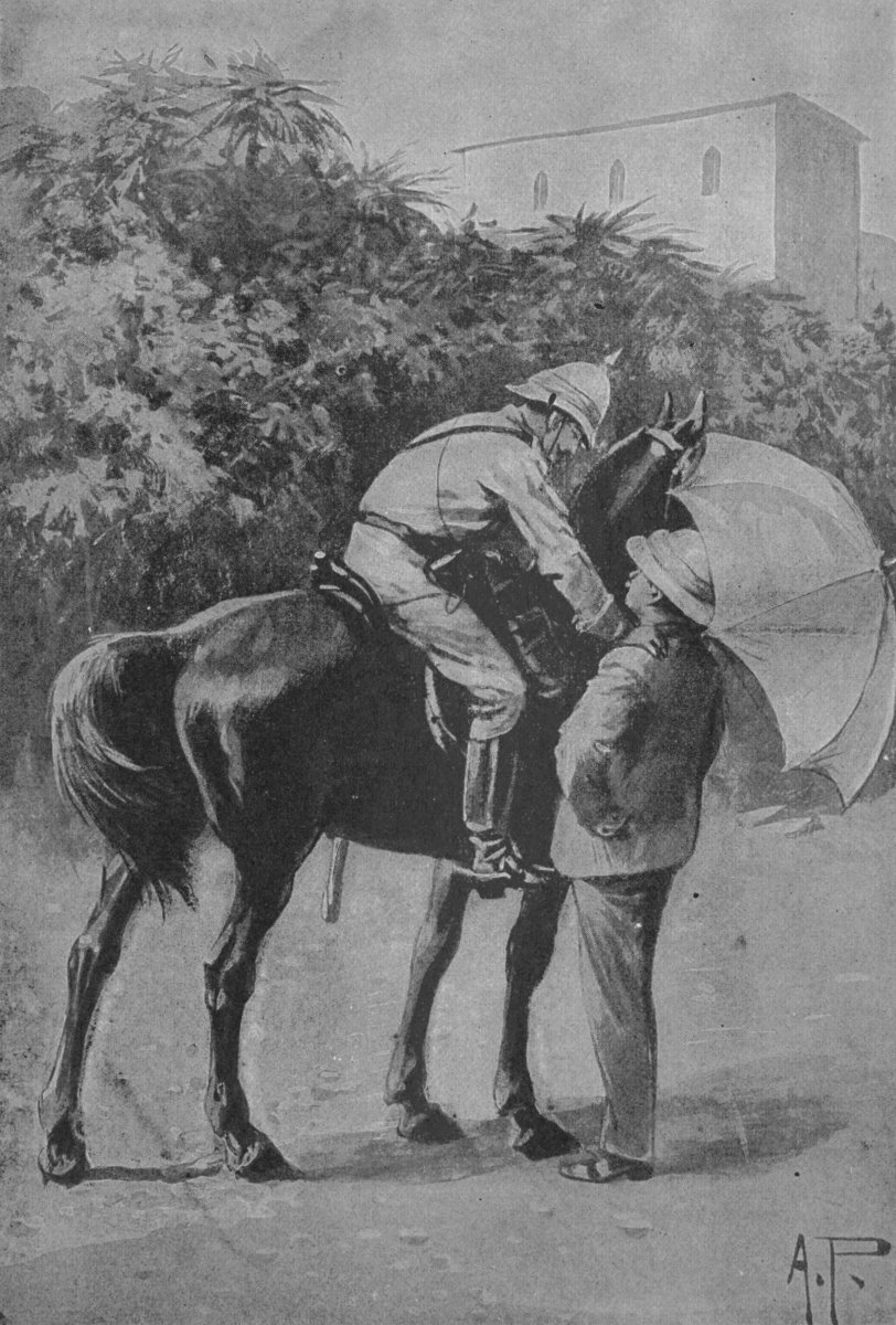 She bestowed a kiss on the top of Dick’s head, remarking as she did so that he was getting disgracefully bald, and rushed away to lavish a series of hugs on Georgia in the privacy of her own room. Her toilet did not take long when she was left alone, and she threw over her head the white shawl Georgia had left with her, and stepped out on the verandah. There was only a faint gleam of moonlight, and a sense of the vastness and dreariness of the desert around crept over her as she tried to distinguish in the blackness the lights of the Alibad cantonments, through which she had passed in the afternoon. The wind was chill, and gathering her wrap more closely round her, she turned to find her way back to the drawing-room. As she did so, the sound of a horse’s footsteps struck upon her ear. Some one was riding past the house at no great distance, riding at a smart pace, which caused a clatter of accoutrements and an occasional sharp metallic ring when the horse’s hoofs came in contact with a rock.