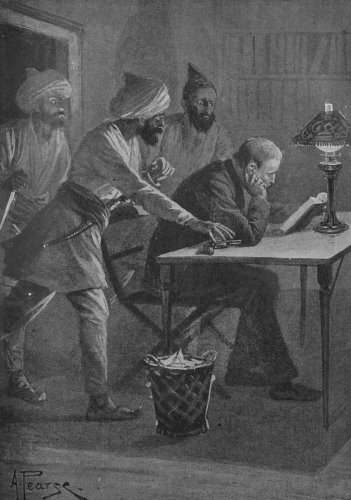 “Another body here!” he said, and some one brought forward a torch. To their astonishment, it was a woman who lay before them, dressed in rich native garments, which, with the coarse chadar covering her face, were soaked with blood. She had been stabbed in the breast, but was still breathing heavily. Sending a messenger for Dr Tighe, they went on, in growing dread as to what they might find. Their fears were justified. On the verandah lay the Sikh sentry, stabbed in the back, and on the floor of his office was the body of the Commissioner, hacked and disfigured almost beyond recognition with a hundred wounds. It did not need the verdict of Dr Tighe to assure the men who stood round that life was extinct.