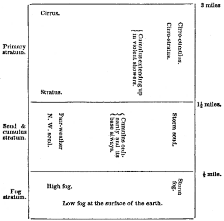| Our rivers return in the form of clouds, and in storms and showers—Definition and character of storms—Differences in the character of the clouds which constitute them—Nomenclature of Howard—Its imperfections—New order of description—Low fog—High fog—Storm fog—Storm scud—N. W. scud—Cumulus—Stratus—Cirrus—Compounds of the two latter—recapitulation in tabular form | 24 |
