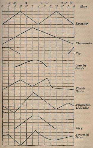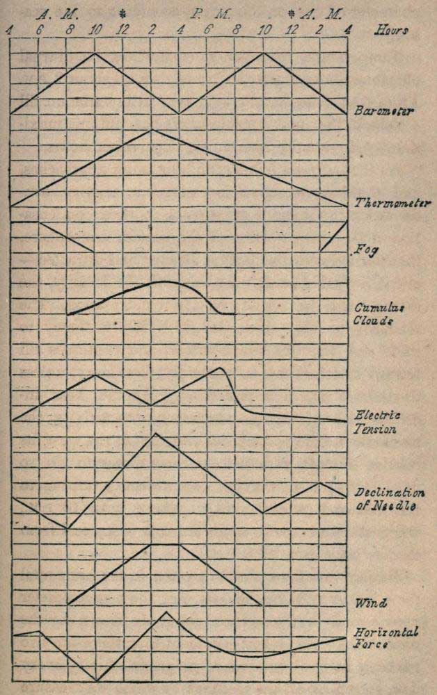 | Further inquiry in relation to the reciprocal action between the earth and the counter-trade—Terrestrial magnetism, and what we know of it—Its elements, and their variations—Their connection with the variations of atmospheric condition—Magnetism acts through its connection with electricity—Character of the latter and its variations—Their connection with atmospheric conditions—Electricity as well as magnetism in excess over this country—Effects of it upon our climate—Closer consideration of the atmospheric phenomena—Their diurnal changes and connections compared with those of magnetism and electricity—Grouping of all the diurnal variations—Particular and separate examination of them—Classification of storms—Examination in detail of the several classes and the primary influence of the earth or counter-trade in relation to each | 285 |