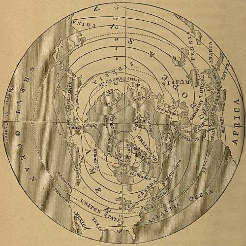 The direct action of the sun’s rays upon the earth, particularly those portions which lie north and south of the tropics, is not the only source from which the supply of heat is derived. Although there is a general increase of heat in spring and summer when the sun travels north, and of cold when he travels south in winter, yet there are frequent irregularities attending both. Very sudden and great changes occur in each of them. Frost sometimes, cool weather often, occurs in midsummer, and considerable heat and tornadoes in midwinter. And ordinarily the maxima and minima of each month and, indeed, of each week are widely apart. Even in the polar regions, in midwinter, where the sun does not shine at all, the same moderating changes with which we are conversant occur in degree. An extract or two from the register found in Dr. Kane’s narrative of the “Grinnell Expedition” will illustrate this.