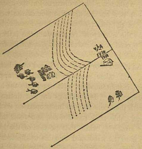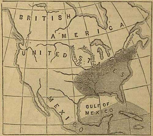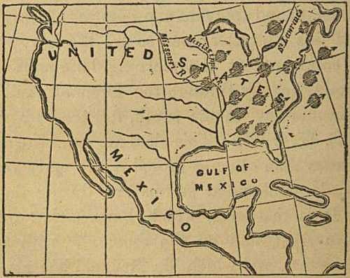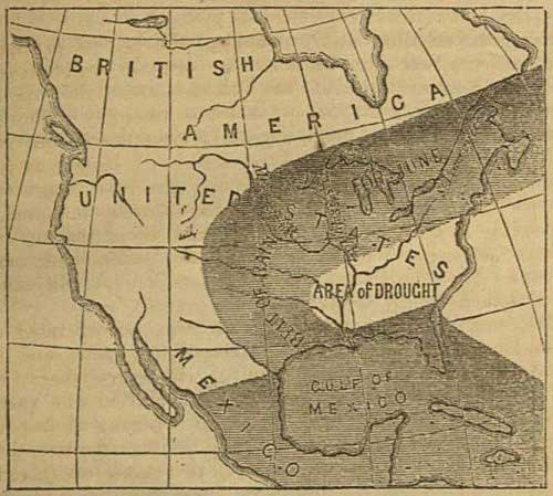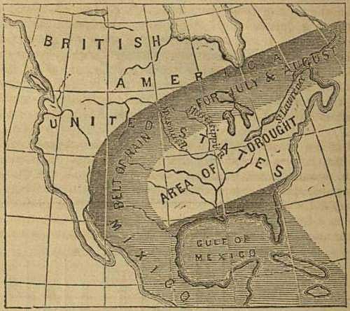 [Pg 412]But the belt of trade continued its progress to the west and north, and during the months of July and August the drought extended in both directions, reaching, in August, from Mississippi, Alabama, Georgia, and South Carolina, to the Lakes, and from the Rocky Mountains to the Atlantic. Its position is shown by the following cut, and the position of the belt of precipitation by the following table.