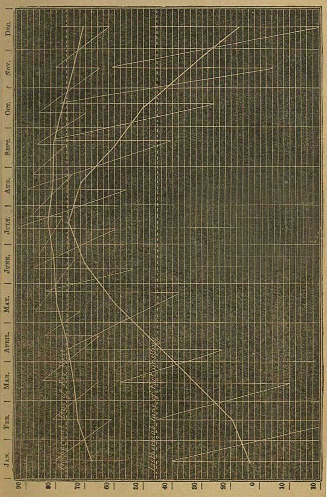 There is a mass of other evidence in these summaries which shows the truth of what I have written. There is not a deduction of Mr. Blodget which it will not explain. The ascent of the summer lines of temperature to the west is explained by the diminution of magnetic intensity. Their descent in winter by the location and attractions of the concentrated trade. The excess of precipitation in Alabama and Mississippi by the succession of summer and winter belts. That of the interior of the Atlantic slope in summer, by the showers which fall upon the elevations; and of the coast, by the easterly storms and their attraction of the surface atmosphere of the ocean, at other seasons. But I cannot further particularize. Even the influence of the spots is clearly demonstrated by the observations at interior stations, which were unaffected by contiguous oceans or elevations. At Forts Washita, Gibson, Scott, Smith, and others, the years 1847 and 1848 were below the mean. All that evidence, and those deductions, however, I must pass by for want of space, and take leave of the subject.