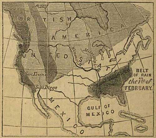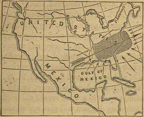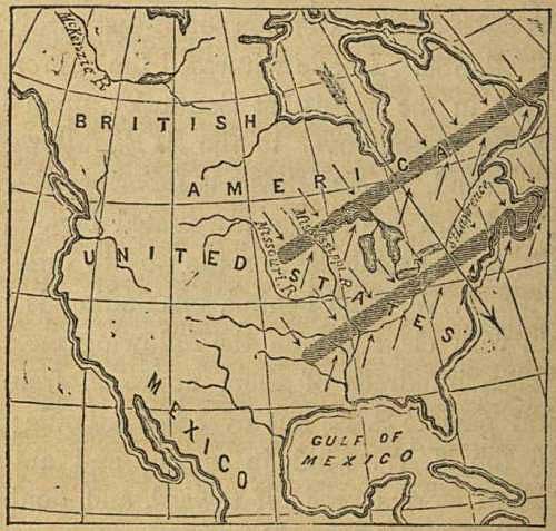 We see, too, that both east and west of the mountains, its focus of precipitation was one month in advance of the mean. At all the[Pg 409] stations where the greatest fall was in March, it should have been in April, and the fall at those points was greatly in excess of the usual quantity. And the same was true of stations reached in April. The concentrated trade, instead of spreading out, and precipitating over the whole south-eastern portion of the continent (its normal condition), was gathered into a wave of greater volume, resulting in greater precipitation, and was rapidly hastening its curve to the west over Texas, and to the north-west over the Indian Territory, and northward on its usual curve to the north and east of them.