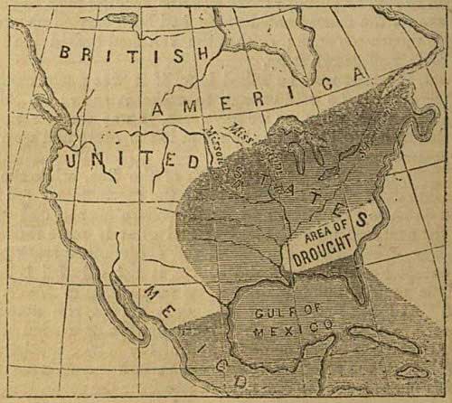 In May and June, the trade became more concentrated, a perfectly developed belt from the Rio Grande to the Lakes and British possessions, and doubtless to the Atlantic, with every where a central focus of excessive precipitation, gathering to itself in one vast wave the current that should have been spread out over the whole country; and leaving every where on its eastern and southern borders, down to the northern edge of the inter-tropical belt of rains—(which extended up to lines drawn from Baton Rouge to Charleston)—a perfectly well developed and defined drought. That drought will long be remembered. The following cuts show, approximately, the location of the belt of precipitation and drought for those months, and the table which follows will show their correctness.