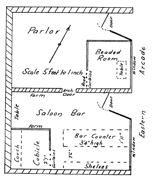 [4] This plan is only approximately to scale. The sloping wall going in to the doorway is actually not at as sharp an angle as the plan shows. Each of the big rooms is, over all, 15ft. 10in. x 11ft. 4in. The cubicle occupies 6ft. x 5ft. 5in. of the one room, and the beaded room occupies 7ft. 6in. x 6ft. 7in. of the other room. The walls of the beaded room went almost up to the ceiling. There was no door where the “arch door” is shown, but only a doorway with curtains hanging in it.