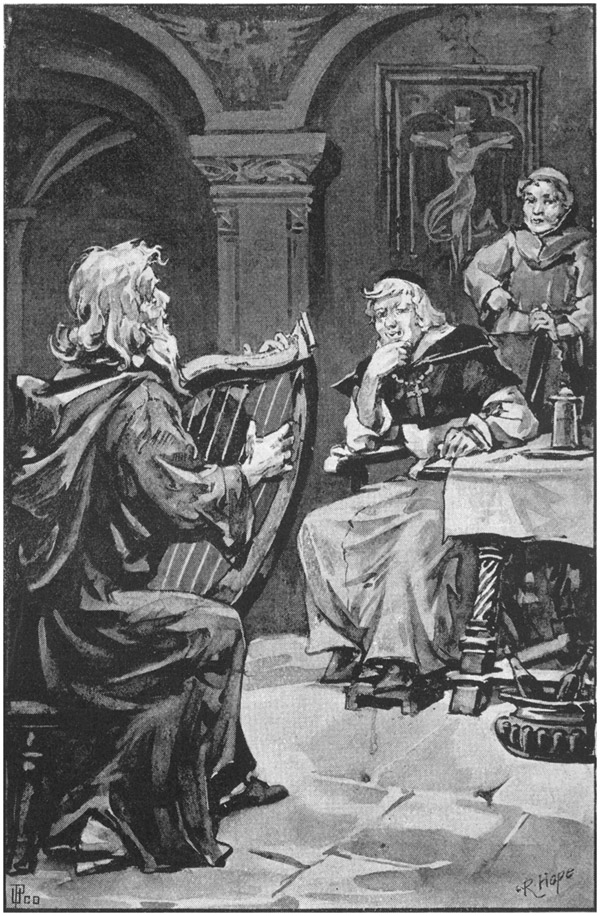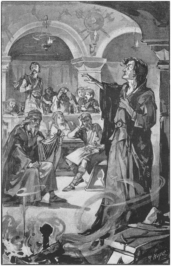 At once all eyes are turned on this strange form, as she, in mocking gesture, casts a look of withering scorn on the scene around her, and startles the jovial vassals with the reproachful words "No heir! No heir!" The laughter is hushed, the pipes no longer sound, for the witch with uplifted hand beckons that she had a message to tell—a message from Death—she might truly say, "What means these bowls of wine—these festive songs?"