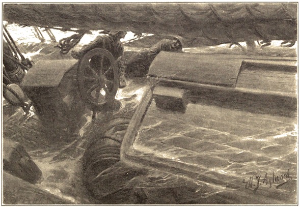 “Begins to look better,” I bawled, taking off the becket from the wheel spokes, which had been hove hard down all night. “She needs a bit of nursing,” and Buck nodded and grinned as he ducked from the flying drift.