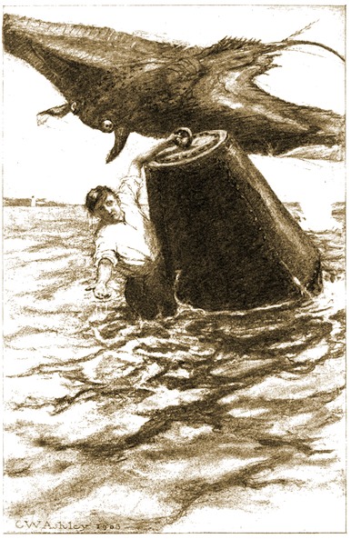 The encounter could not last long. The old fellow was rapidly succumbing to the attacks of his powerful antagonists, and although he still kept the mix-up in a whirl of foam with his desperate struggles, he could not hope to last against two such pirates as were now pitted against him. One of them struck him fiercely and tore his throat open, ripping his pouch from30 end to end. He was weakening fast and knew the struggle must end in another rush. Both eagles came at him at once, uttering hoarse cries, and drawing back his head he made one last, desperate stroke with his hooked beak. Then something seemed to crash down upon his foes from above. An oar-blade whirled in the sunshine and struck the leading eagle upon the head, knocking him lifeless upon the sea. Then the other rose quickly and started off to the northward as the form of the keeper towered above in the bow of the approaching boat.