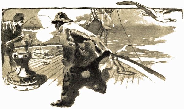 He shoved his small boat off and sprang into her. Then he stepped the mast, and hauling aft the sheet swung her head around and stood off16 the reef, riding easily over the low swell. High above him was the lantern, and he looked up to see Bill gazing down at him and pointing toward the southward, where a ripple showed the breaching fish. His lines were in the after locker, and he soon had them out, one of them with a wooden squid trolling over the stern as the little craft gathered headway.